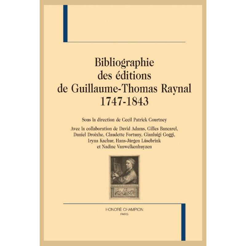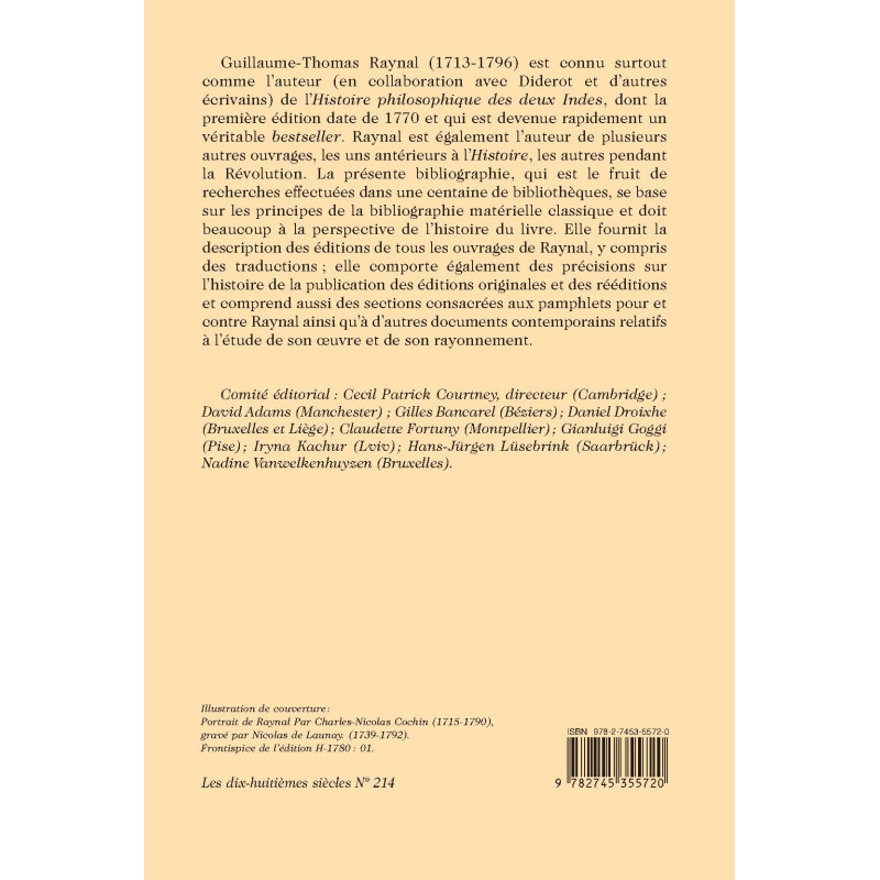 Guillaume-Thomas Raynal (1713-1796) est connu surtout comme l’auteur (en collaboration avec Diderot et d’autres écrivains) de l’Histoire philosophique des deux Indes, dont la première édition date de 1770 et qui est devenue rapidement un véritable bestseller. Raynal est également l’auteur de plusieurs autres ouvrages, les uns antérieurs à l’Histoire, les autres pendant la Révolution. La présente bibliographie, qui est le fruit de recherches effectuées dans une centaine de bibliothèques, se base sur les principes de la bibliographie matérielle classique et doit beaucoup à la perspective de l’histoire du livre. Elle fournit la description des éditions de tous les ouvrages de Raynal, y compris des traductions ; elle comporte également des précisions sur l’histoire de la publication des éditions originales et des rééditions et comprend aussi des sections consacrées aux pamphlets pour et contre Raynal ainsi qu’à d’autres documents contemporains relatifs à l’étude de son oeuvre et de son rayonnement.