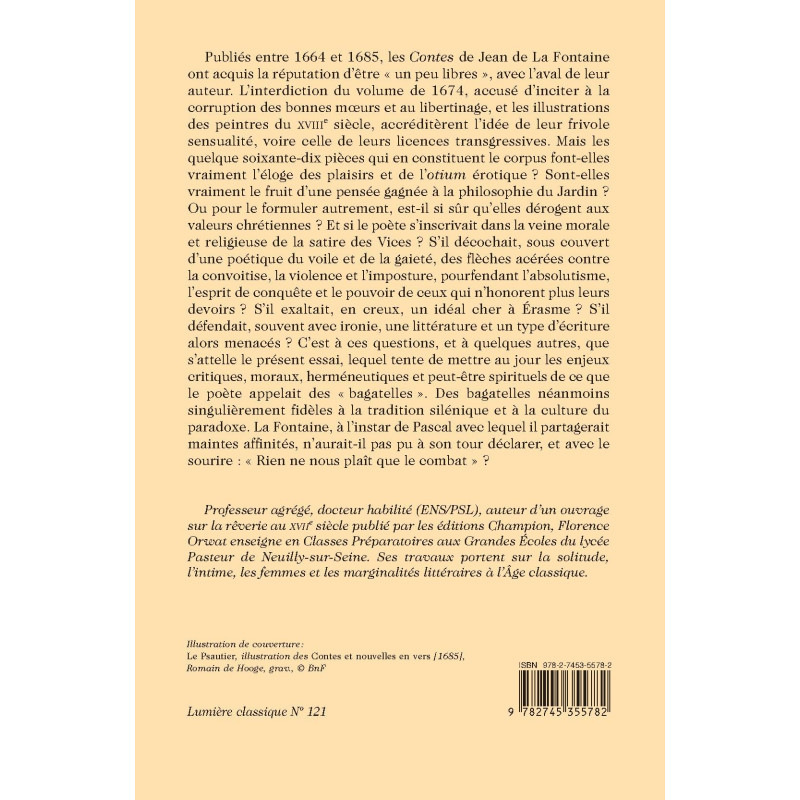 Publiés entre 1664 et 1685, les Contes de Jean de La Fontaine ont acquis la réputation d’être « un peu libres », avec l’aval de leur auteur. L’interdiction du volume de 1674, accusé d’inciter à la corruption des bonnes mœurs et au libertinage, et les illustrations des peintres du XVIIIe siècle, accréditèrent l’idée de leur frivole sensualité, voire celle de leurs licences transgressives. Mais les quelque soixante-dix pièces qui en constituent le corpus font-elles vraiment l’éloge des plaisirs et de l’otium érotique ? Sont-elles vraiment le fruit d’une pensée gagnée à la philosophie du Jardin ? Ou pour le formuler autrement, est-il si sûr qu’elles dérogent aux valeurs chrétiennes ? Et si le poète s’inscrivait dans la veine morale et religieuse de la satire des Vices ? S’il décochait, sous couvert d’une poétique du voile et de la gaieté, des flèches acérées contre la convoitise, la violence et l’imposture, pourfendant l’absolutisme, l’esprit de conquête et le pouvoir de ceux qui n’honorent plus leurs devoirs ? S’il exaltait, en creux, un idéal cher à Érasme ? S’il défendait, souvent avec ironie, une littérature et un type d’écriture alors menacés ? C’est à ces questions, et à quelques autres, que s’attelle le présent essai, lequel tente de mettre au jour les enjeux critiques, moraux, herméneutiques et peut-être spirituels de ce que le poète appelait des « bagatelles ». Des bagatelles néanmoins singulièrement fidèles à la tradition silénique et à la culture du paradoxe. La Fontaine, à l’instar de Pascal avec lequel il partagerait maintes affinités, n’aurait-il pas pu à son tour déclarer, et avec le sourire : « Rien ne nous plaît que le combat » ?