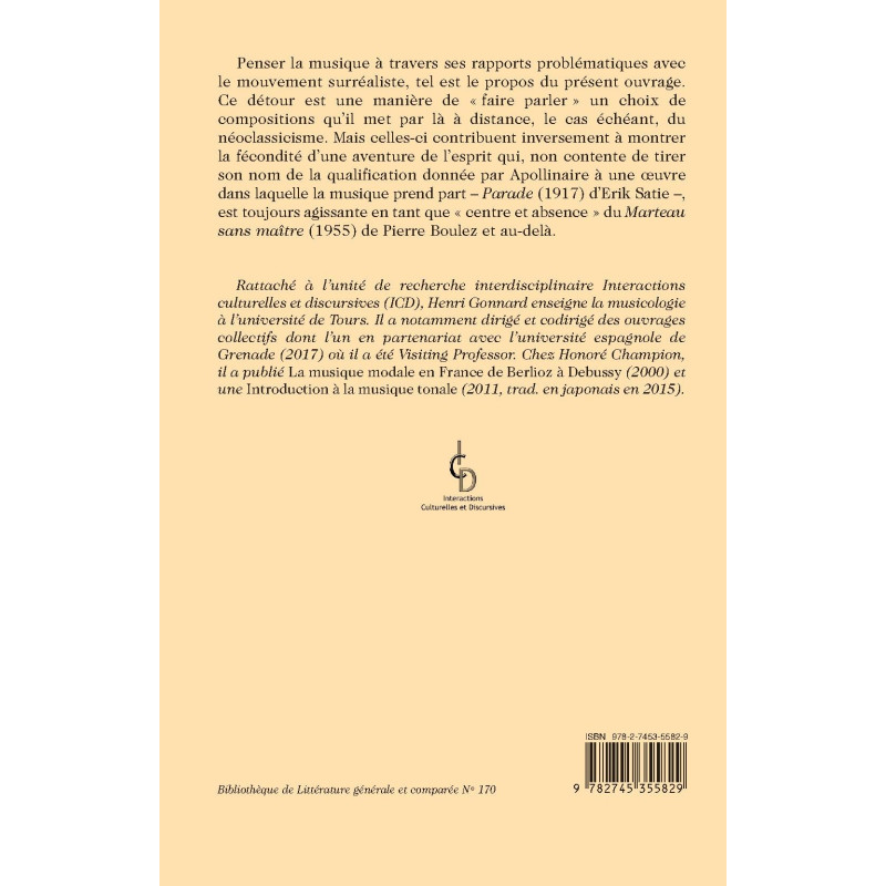 Penser la musique à travers ses rapports problématiques avec le mouvement surréaliste, tel est le propos du présent ouvrage. Ce détour est une manière de « faire parler » un choix de compositions qu’il met par là à distance, le cas échéant, du néoclassicisme. Mais celles-ci contribuent inversement à montrer la fécondité d’une aventure de l’esprit qui, non contente de tirer son nom de la qualification donnée par Apollinaire à une œuvre dans laquelle la musique prend part – Parade (1917) d’Erik Satie –, est toujours agissante en tant que « centre et absence » du Marteau sans maître (1955) de Pierre Boulez et au-delà.