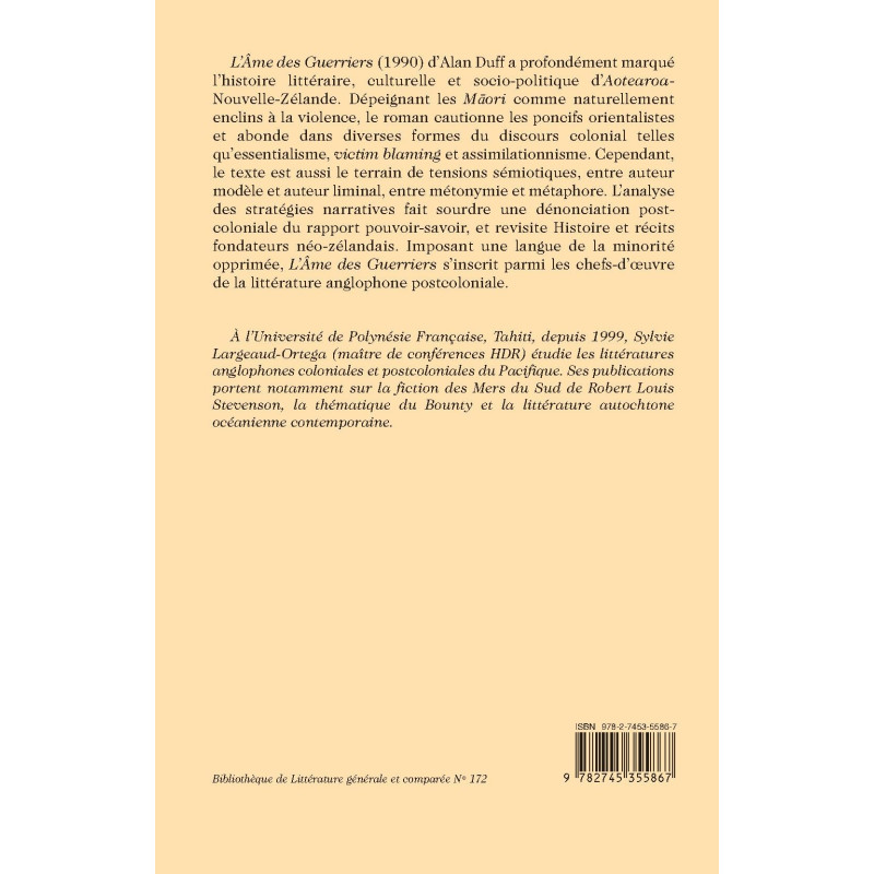 L’Âme des Guerriers (1990) d’Alan Duff a profondément marqué l’histoire littéraire, culturelle et socio-politique d’Aotearoa-Nouvelle-Zélande. Dépeignant les Māori comme naturellement enclins à la violence, le roman cautionne les poncifs orientalistes et abonde dans diverses formes du discours colonial telles qu’essentialisme, victim blaming et assimilationnisme. Cependant, le texte est aussi le terrain de tensions sémiotiques, entre auteur modèle et auteur liminal, entre métonymie et métaphore. L’analyse des stratégies narratives fait sourdre une dénonciation postcoloniale du rapport pouvoir-savoir, et revisite Histoire et récits fondateurs néo-zélandais. Imposant une langue de la minorité opprimée, L’Âme des Guerriers s’inscrit parmi les chefs-d’œuvre de la littérature anglophone postcoloniale.