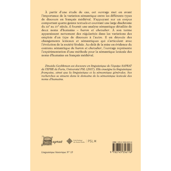 À partir d’une étude de cas, cet ouvrage met en avant l’importance de la variation sémantique entre les différents types de discours en français médiéval. S’appuyant sur un corpus comportant quatre genres textuels et couvrant une large diachronie du XIIe au XVe siècle, il fournit une analyse sémantique détaillée de deux noms d’humains – baron et chevalier. À son terme apparaissent nettement des régularités dans les variations des emplois d’un type de discours à l’autre. Il en découle des changements lexicaux et sémantiques qui s’articulent avec l’évolution de la société féodale. Au-delà de la mise en évidence du contenu sémantique de baron et chevalier, l’ouvrage représente l’expérimentation d’une méthode pour la sémantique lexicale des noms d’humains en français médiéval.