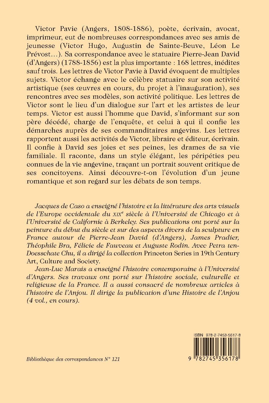 Victor Pavie (Angers, 1808-1886), poète, écrivain, avocat, imprimeur, eut de nombreuses correspondances avec ses amis de jeunesse (Victor Hugo, Augustin de Sainte-Beuve, Léon Le Prévost…). Sa correspondance avec le statuaire Pierre-Jean David (d’Angers) (1788-1856) est la plus importante : 168 lettres, inédites sauf trois. Les lettres de Victor Pavie à David évoquent de multiples sujets. Victor échange avec le célèbre statuaire sur son activité artistique (ses œuvres en cours, du projet à l’inauguration), ses rencontres avec ses modèles, son activité politique. Les lettres de Victor sont le lieu d’un dialogue sur l’art et les artistes de leur temps. Victor est aussi l’homme que David, s’informant sur son père décédé, charge de l’enquête, et celui à qui il confie les démarches auprès de ses commanditaires angevins. Les lettres rapportent aussi les activités de Victor, libraire et éditeur, écrivain. Il confie à David ses joies et ses peines, les drames de sa vie familiale. Il raconte, dans un style élégant, les péripéties peu connues de la vie angevine, traçant un portrait souvent critique de ses concitoyens. Ainsi découvre-t-on l’évolution d’un jeune romantique et son regard sur les débats de son temps.
