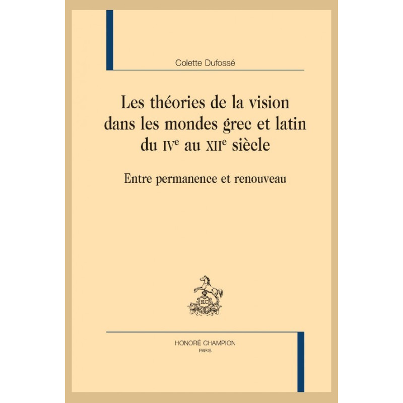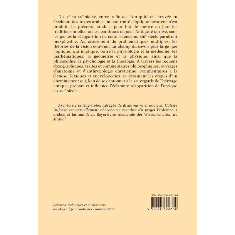 Du IVe au XIIe siècle, entre la fin de l’Antiquité et l’arrivée en Occident des textes arabes, aucun traité d’optique novateur n’est produit. La présente étude a pour but de mettre au jour les traditions intellectuelles, continues depuis l’Antiquité tardive, sans lesquelles la réapparition de cette science au XIIIe siècle paraîtrait inexplicable. Au croisement de problématiques multiples, les théories de la vision couvrent un champ du savoir plus large que l’optique, qui implique, outre la physiologie et la médecine, les mathématiques, la géométrie et la physique, ainsi que la philosophie, la psychologie et la théologie. À travers les recueils doxographiques, traités et commentaires philosophiques, ouvrages d’anatomie et d’anthropologie chrétienne, commentaires à la Genèse, lexiques et encyclopédies, se dessinent les étapes d’un cheminement qui, loin de se cantonner à la sauvegarde de l’héritage antique, prépare et influence l’éclatante réapparition de l’optique au XIIIe siècle.