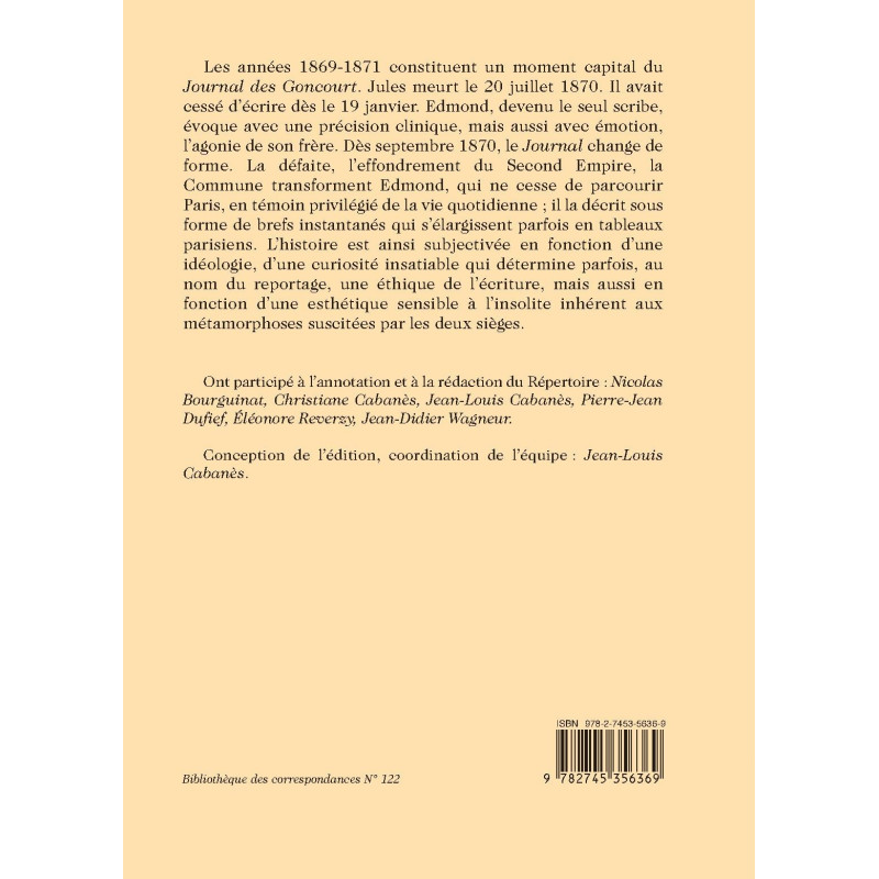 Les années 1869-1871 constituent un moment capital du Journal des Goncourt. Jules meurt le 20 juillet 1870. Il avait cessé d’écrire dès le 19 janvier. Edmond, devenu le seul scribe, évoque avec une précision clinique, mais aussi avec émotion, l’agonie de son frère. Dès septembre 1870, le Journal change de forme. La défaite, l’effondrement du Second Empire, la Commune transforment Edmond, qui ne cesse de parcourir Paris, en témoin privilégié de la vie quotidienne ; il la décrit sous forme de brefs instantanés qui s’élargissent parfois en tableaux parisiens. L’histoire est ainsi subjectivée en fonction d’une idéologie, d’une curiosité insatiable qui détermine parfois, au nom du reportage, une éthique de l’écriture, mais aussi en fonction d’une esthétique sensible à l’insolite inhérent aux métamorphoses suscitées par les deux sièges.