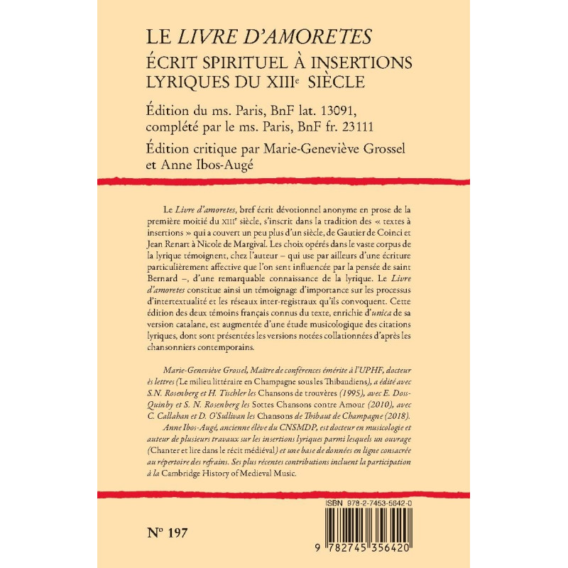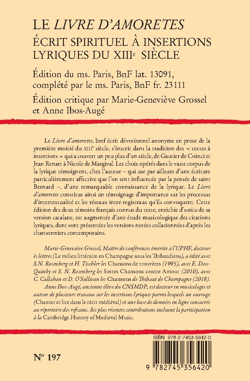 Le Livre d’amoretes, bref écrit dévotionnel anonyme en prose de la première moitié du XIIIe siècle, s’inscrit dans la tradition des « textes à insertions » qui a couvert un peu plus d’un siècle, de Gautier de Coinci et Jean Renart à Nicole de Margival. Les choix opérés dans le vaste corpus de la lyrique témoignent, chez l’auteur – qui use par ailleurs d’une écriture particulièrement affective que l’on sent influencée par la pensée de saint Bernard –, d’une remarquable connaissance de la lyrique. Le Livre d’amoretes constitue ainsi un témoignage d’importance sur les processus d’intertextualité et les réseaux inter-registraux qu’ils convoquent. Cette édition des deux témoins français connus du texte, enrichie d’unica de sa version catalane, est augmentée d’une étude musicologique des citations lyriques, dont sont présentées les versions notées collationnées d’après les chansonniers contemporains.