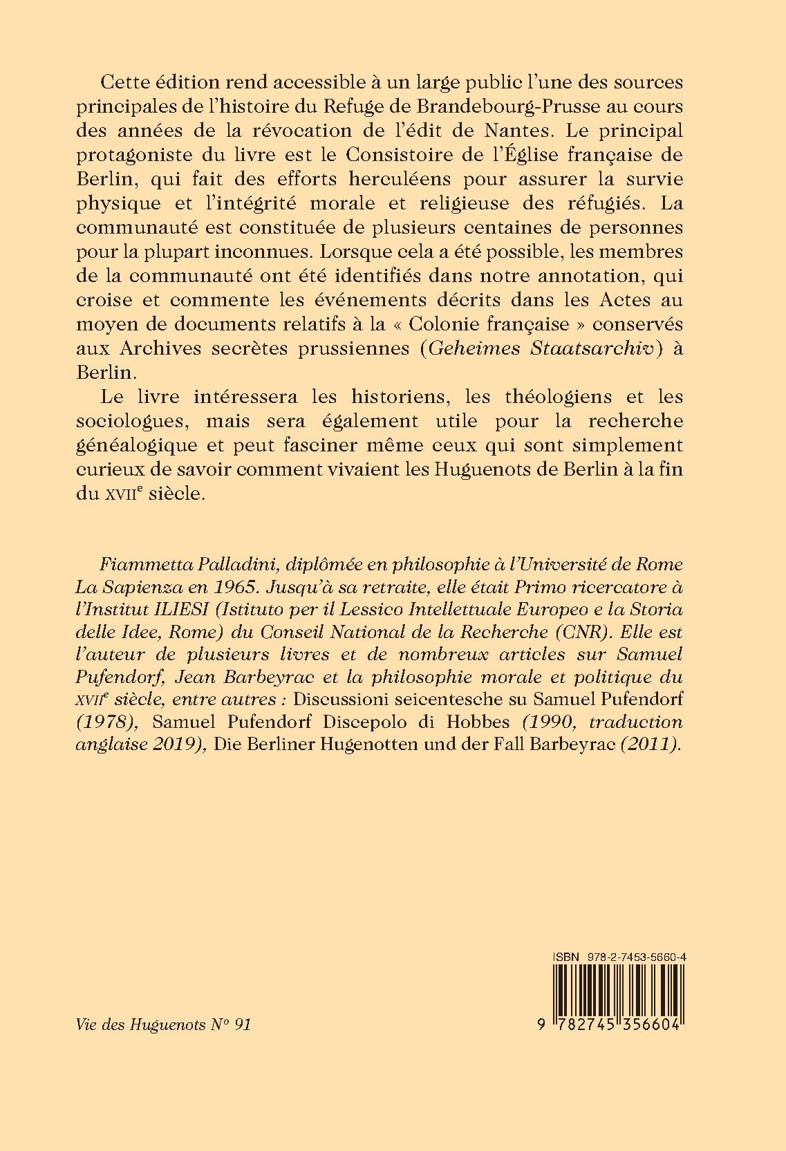 Cette édition rend accessible à un large public l’une des sources principales de l’histoire du Refuge de Brandebourg-Prusse au cours des années de la révocation de l’édit de Nantes. Le principal protagoniste du livre est le Consistoire de l’Église française de Berlin, qui fait des efforts herculéens pour assurer la survie physique et l’intégrité morale et religieuse des réfugiés. La communauté est constituée de plusieurs centaines de personnes pour la plupart inconnues. Lorsque cela a été possible, les membres de la communauté ont été identifiés dans notre annotation, qui croise et commente les événements décrits dans les Actes au moyen de documents relatifs à la « Colonie française » conservés aux Archives secrètes prussiennes (Geheimes Staatsarchiv) à Berlin.