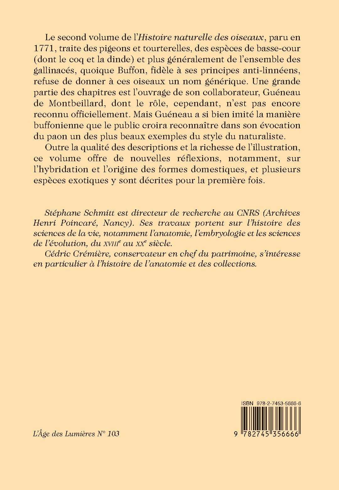 Le second volume de l’Histoire naturelle des oiseaux, paru en 1771, traite des pigeons et tourterelles, des espèces de basse-cour (dont le coq et la dinde) et plus généralement de l’ensemble des gallinacés, quoique Buffon, fidèle à ses principes anti-linnéens, refuse de donner à ces oiseaux un nom générique. Une grande partie des chapitres est l’ouvrage de son collaborateur, Guéneau de Montbeillard, dont le rôle, cependant, n’est pas encore reconnu officiellement. Mais Guéneau a si bien imité la manière buffonienne que le public croira reconnaître dans son évocation du paon un des plus beaux exemples du style du naturaliste.