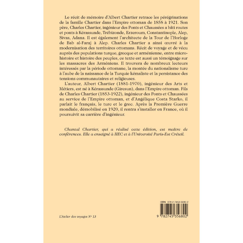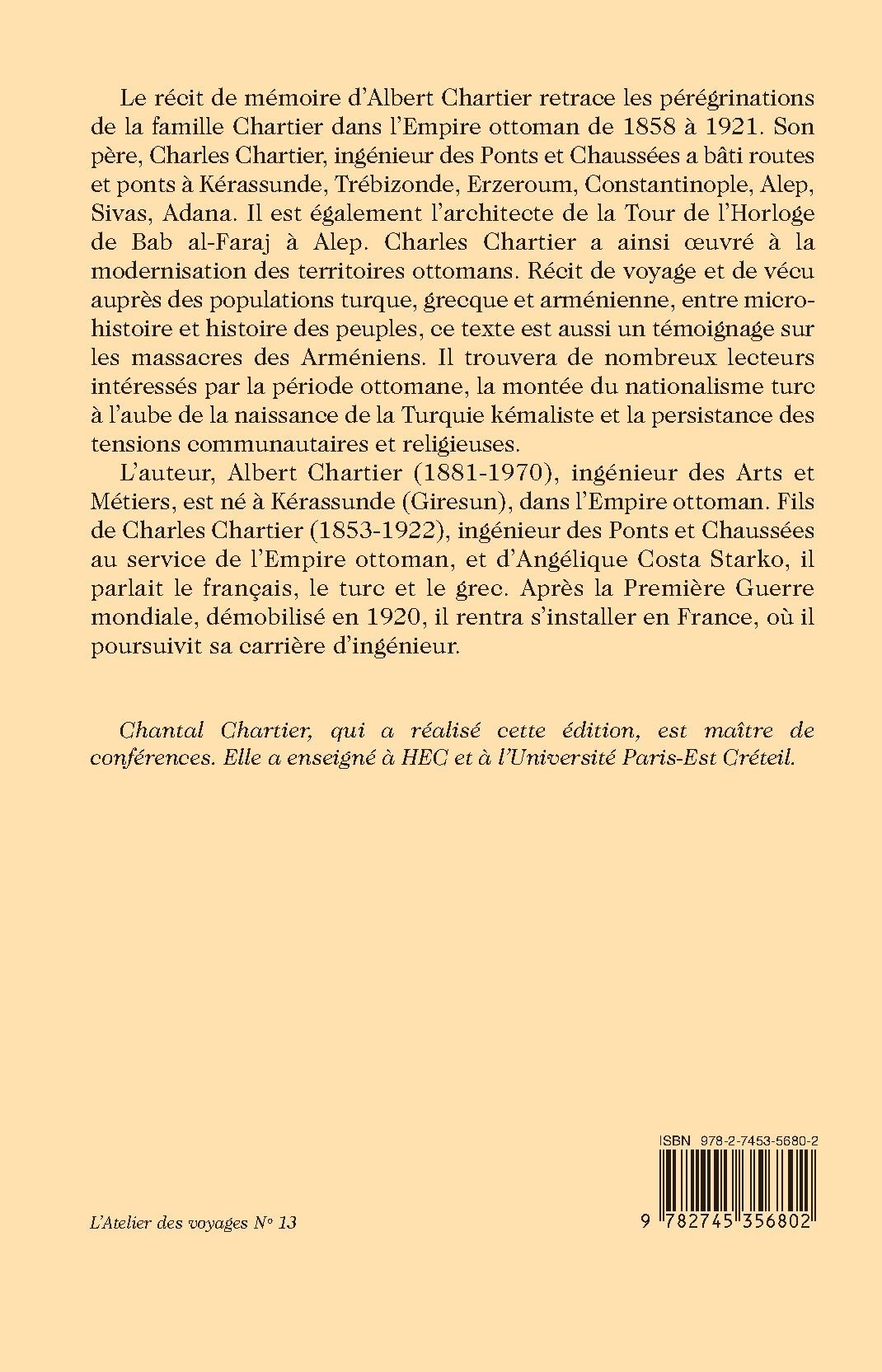 Le récit de mémoire d’Albert Chartier retrace les pérégrinations de la famille Chartier dans l’Empire ottoman de 1858 à 1921. Son père, Charles Chartier, ingénieur des Ponts et Chaussées a bâti routes et ponts à Kérassunde, Trébizonde, Erzeroum, Constantinople, Alep, Sivas, Adana. Il est également l’architecte de la Tour de l’Horloge de Bab al-Faraj à Alep. Charles Chartier a ainsi œuvré à la modernisation des territoires ottomans. Récit de voyage et de vécu auprès des populations turque, grecque et arménienne, entre micro-histoire et histoire des peuples, ce texte est aussi un témoignage sur les massacres des Arméniens. Il trouvera de nombreux lecteurs intéressés par la période ottomane, la montée du nationalisme turc à l’aube de la naissance de la Turquie kémaliste et la persistance des tensions communautaires et religieuses.