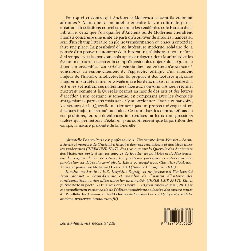 Pour quoi et contre qui Anciens et Modernes se sont-ils vraiment affrontés ? Alors que la monarchie encadre la vie culturelle par la création d’institutions nouvelles comme les académies et le Bureau de la Librairie, ceux que l’on qualifie d’Anciens ou de Modernes cherchent moins à construire une unité de parti qu’à cultiver de mobiles nuances au sein d’un champ littéraire en pleine transformation où chacun entend se faire une place. La possibilité d’une littérature moderne, solidaire de la pensée d’un pouvoir autonome de la littérature, s’élabore au cœur d’une dialectique avec les pouvoirs politiques et religieux dont la subtilité et les évolutions peuvent éclairer la compréhension des enjeux de la Querelle dans son ensemble. Les articles réunis dans ce volume s’attachent à contribuer au renouvellement de l’approche critique d’un moment majeur de l’histoire intellectuelle. Ils proposent des lectures qui, sans majorer ni surdéterminer le clivage entre les deux partis, ni prendre à la lettre les scénographies polémiques face aux pouvoirs d’Ancien régime, montrent comment la Querelle permet au monde des arts et des lettres d’accéder à une certaine autonomie, en composant avec les éventuels antagonismes partisans mais sans s’y subordonner. Face aux pouvoirs, les acteurs de la Querelle ne tiennent pas un propos univoque ni un discours toujours assumé ou stable. Ce sont alors les contradictions de ces positions, leurs coïncidences inattendues ou leurs transgressions tacites qui permettent d’éclairer, plus subtilement que la partition des camps, la nature profonde de la Querelle.