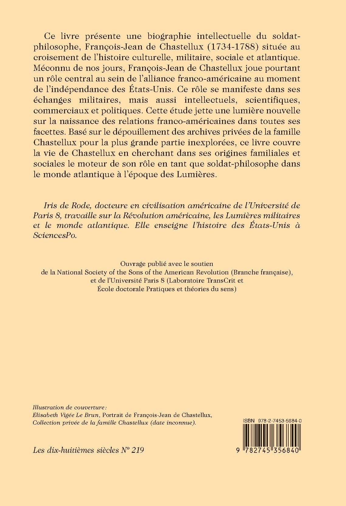Ce livre présente une biographie intellectuelle du soldatphilosophe, François-Jean de Chastellux (1734-1788) située au croisement de l’histoire culturelle, militaire, sociale et atlantique. Méconnu de nos jours, François-Jean de Chastellux joue pourtant un rôle central au sein de l’alliance franco-américaine au moment de l’indépendance des États-Unis. Ce rôle se manifeste dans ses échanges militaires, mais aussi intellectuels, scientifiques, commerciaux et politiques. Cette étude jette une lumière nouvelle sur la naissance des relations franco-américaines dans toutes ses facettes. Basé sur le dépouillement des archives privées de la famille Chastellux pour la plus grande partie inexplorées, ce livre couvre la vie de Chastellux en cherchant dans ses origines familiales et sociales le moteur de son rôle en tant que soldat-philosophe dans le monde atlantique à l’époque des Lumières.