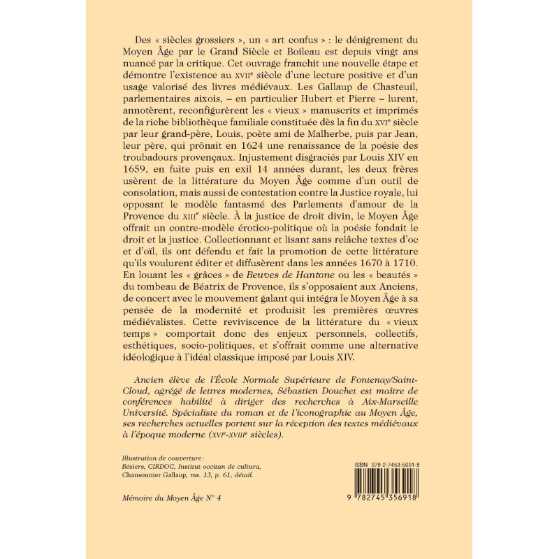 Des « siècles grossiers », un « art confus » : le dénigrement du Moyen Âge par le Grand Siècle et Boileau est depuis vingt ans nuancé par la critique. Cet ouvrage franchit une nouvelle étape et démontre l’existence au XVIIe siècle d’une lecture positive et d’un usage valorisé des livres médiévaux. Les Gallaup de Chasteuil, parlementaires aixois, – en particulier Hubert et Pierre – lurent, annotèrent, reconfigurèrent les « vieux » manuscrits et imprimés de la riche bibliothèque familiale constituée dès la fin du XVIe siècle par leur grand-père, Louis, poète ami de Malherbe, puis par Jean, leur père, qui prônait en 1624 une renaissance de la poésie des troubadours provençaux. Injustement disgraciés par Louis XIV en 1659, en fuite puis en exil 14 années durant, les deux frères usèrent de la littérature du Moyen Âge comme d’un outil de consolation, mais aussi de contestation contre la Justice royale, lui opposant le modèle fantasmé des Parlements d’amour de la Provence du XIIIe siècle. À la justice de droit divin, le Moyen Âge offrait un contre-modèle érotico-politique où la poésie fondait le droit et la justice. Collectionnant et lisant sans relâche textes d’oc et d’oïl, ils ont défendu et fait la promotion de cette littérature qu’ils voulurent éditer et diffusèrent dans les années 1670 à 1710. En louant les « grâces » de Beuves de Hantone ou les « beautés » du tombeau de Béatrix de Provence, ils s’opposaient aux Anciens, de concert avec le mouvement galant qui intégra le Moyen Âge à sa pensée de la modernité et produisit les premières œuvres médiévalistes. Cette reviviscence de la littérature du « vieux temps » comportait donc des enjeux personnels, collectifs, esthétiques, socio-politiques, et s’offrait comme une alternative idéologique à l’idéal classique imposé par Louis XIV.