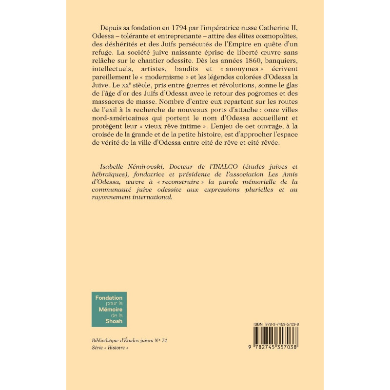 Depuis sa fondation en 1794 par l’impératrice russe Catherine II, Odessa – tolérante et entreprenante – attire des élites cosmopolites, des déshérités et des Juifs persécutés de l’Empire en quête d’un refuge. La société juive naissante éprise de liberté œuvre sans relâche sur le chantier odessite. Dès les années 1860, banquiers, intellectuels, artistes, bandits et « anonymes » écrivent pareillement le « modernisme » et les légendes colorées d’Odessa la Juive. Le XXe siècle, pris entre guerres et révolutions, sonne le glas de l’âge d’or des Juifs d’Odessa avec le retour des pogromes et des massacres de masse. Nombre d’entre eux repartent sur les routes de l’exil à la recherche de nouveaux ports d’attache : onze villes nord-américaines qui portent le nom d’Odessa accueillent et protègent leur « vieux rêve intime ». L’enjeu de cet ouvrage, à la croisée de la grande et de la petite histoire, est d’approcher l’espace de vérité de la ville d’Odessa entre cité de rêve et cité rêvée.