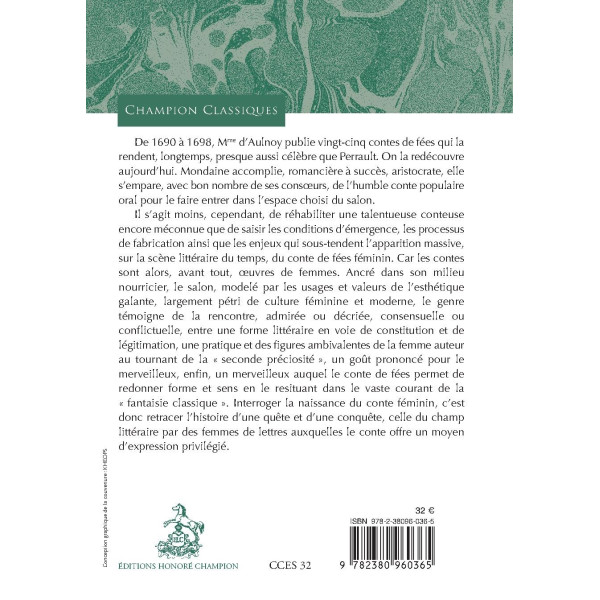 Il s’agit moins, cependant, de réhabiliter une talentueuse conteuse encore méconnue que de saisir les conditions d’émergence, les processus de fabrication ainsi que les enjeux qui sous-tendent l’apparition massive, sur la scène littéraire du temps, du conte de fées féminin. Car les contes sont alors, avant tout, œuvres de femmes. Ancré dans son milieu nourricier, le salon, modelé par les usages et valeurs de l’esthétique galante, largement pétri de culture féminine et moderne, le genre témoigne de la rencontre, admirée ou décriée, consensuelle ou conflictuelle, entre une forme littéraire en voie de constitution et de légitimation, une pratique et des figures ambivalentes de la femme auteur au tournant de la « seconde préciosité », un goût prononcé pour le merveilleux, enfin, un merveilleux auquel le conte de fées permet de redonner forme et sens en le resituant dans le vaste courant de la « fantaisie classique ». Interroger la naissance du conte féminin, c’est donc retracer l’histoire d’une quête et d’une conquête, celle du champ littéraire par des femmes de lettres auxquelles le conte offre un moyen d’expression privilégié.
