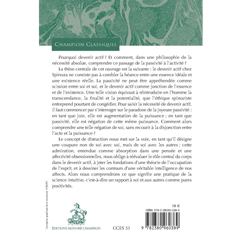 La thèse centrale de cet ouvrage est la suivante : le devenir actif chez Spinoza ne consiste pas à combler la béance entre une essence idéale et une existence réelle. La passivité ne peut être appréhendée comme scission entre soi et soi, et le devenir actif comme jonction de l’essence et de l’existence. Une telle vision équivaut à réintroduire en l’homme la transcendance, la finalité et la potentialité, que l’éthique spinoziste entreprend pourtant de congédier. Pour saisir la nécessité de devenir actif, il faut commencer par s’interroger sur le paradoxe de la joyeuse passivité : en tant que joie, elle est augmentation de la puissance ; en tant que passivité, elle est négation de cette même puissance. Comment alors comprendre une telle négation de soi, sans recourir à la disjonction entre l’acte et la puissance ?