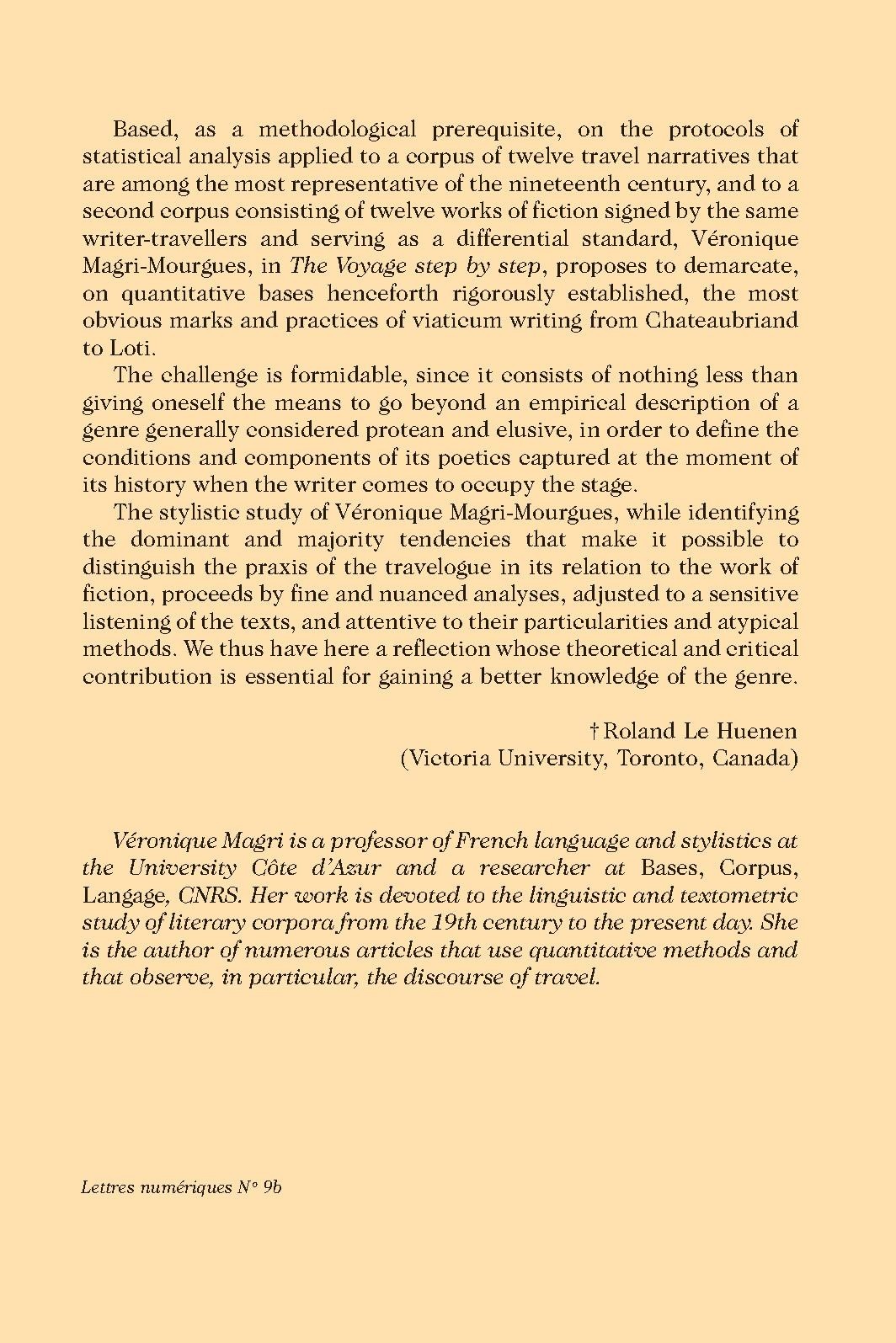 Based, as a methodological prerequisite, on the protocols of statistical analysis applied to a corpus of twelve travel narratives that are among the most representative of the nineteenth century, and to a second corpus consisting of twelve works of fiction signed by the same writer-travellers and serving as a differential standard, Véronique Magri-Mourgues, in The Voyage step by step, proposes to demarcate, on quantitative bases henceforth rigorously established, the most obvious marks and practices of viaticum writing from Chateaubriand to Loti.