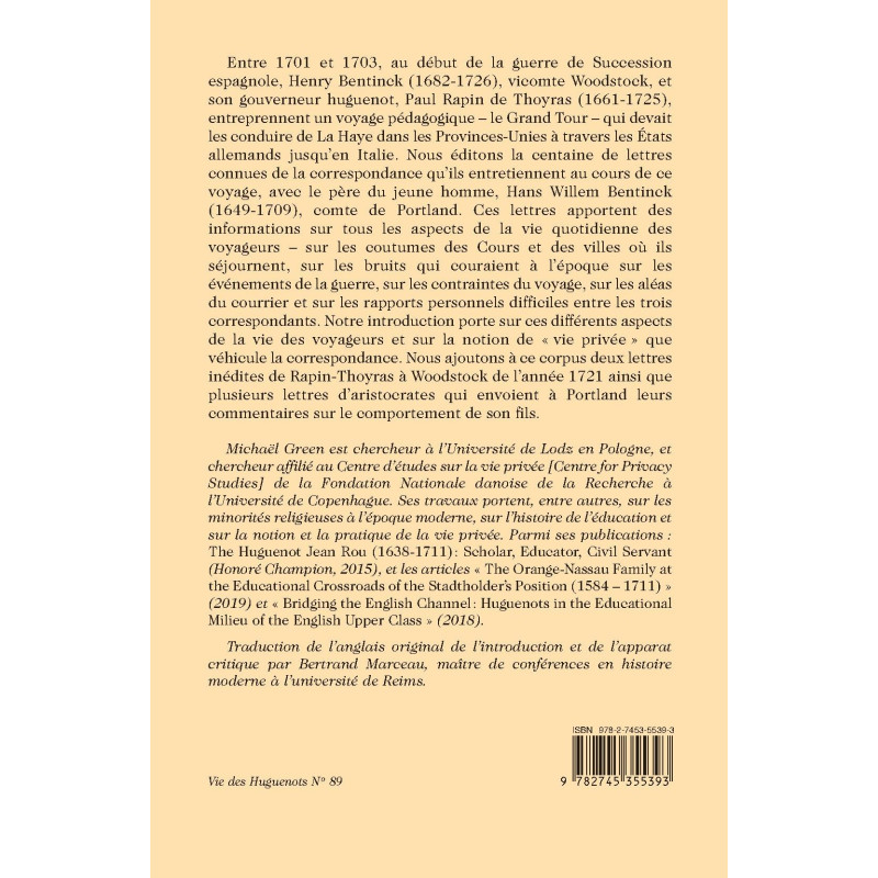Entre 1701 et 1703, au début de la guerre de Succession espagnole, Henry Bentinck (1682-1726), vicomte Woodstock, et son gouverneur huguenot, Paul Rapin de Thoyras (1661-1725), entreprennent un voyage pédagogique – le Grand Tour – qui devait les conduire de La Haye dans les Provinces-Unies à travers les États allemands jusqu’en Italie. Nous éditons la centaine de lettres connues de la correspondance qu’ils entretiennent au cours de ce voyage, avec le père du jeune homme, Hans Willem Bentinck (1649-1709), comte de Portland. Ces lettres apportent des informations sur tous les aspects de la vie quotidienne des voyageurs – sur les coutumes des Cours et des villes où ils séjournent, sur les bruits qui couraient à l’époque sur les événements de la guerre, sur les contraintes du voyage, sur les aléas du courrier et sur les rapports personnels difficiles entre les trois correspondants. Notre introduction porte sur ces différents aspects de la vie des voyageurs et sur la notion de « vie privée » que véhicule la correspondance. Nous ajoutons à ce corpus deux lettres inédites de Rapin-Thoyras à Woodstock de l’année 1721 ainsi que plusieurs lettres d’aristocrates qui envoient à Portland leurs commentaires sur le comportement de son fils.