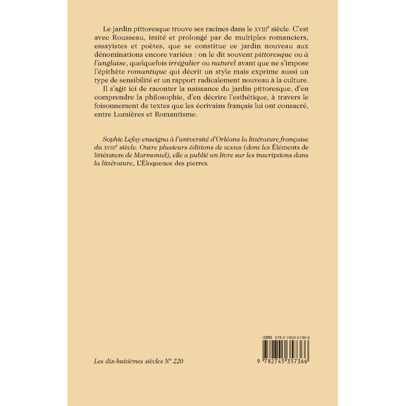 Il s’agit ici de raconter la naissance du jardin pittoresque, d’en comprendre la philosophie, d’en décrire l’esthétique, à travers le foisonnement de textes que les écrivains français lui ont consacré, entre Lumières et Romantisme.
