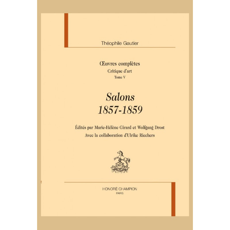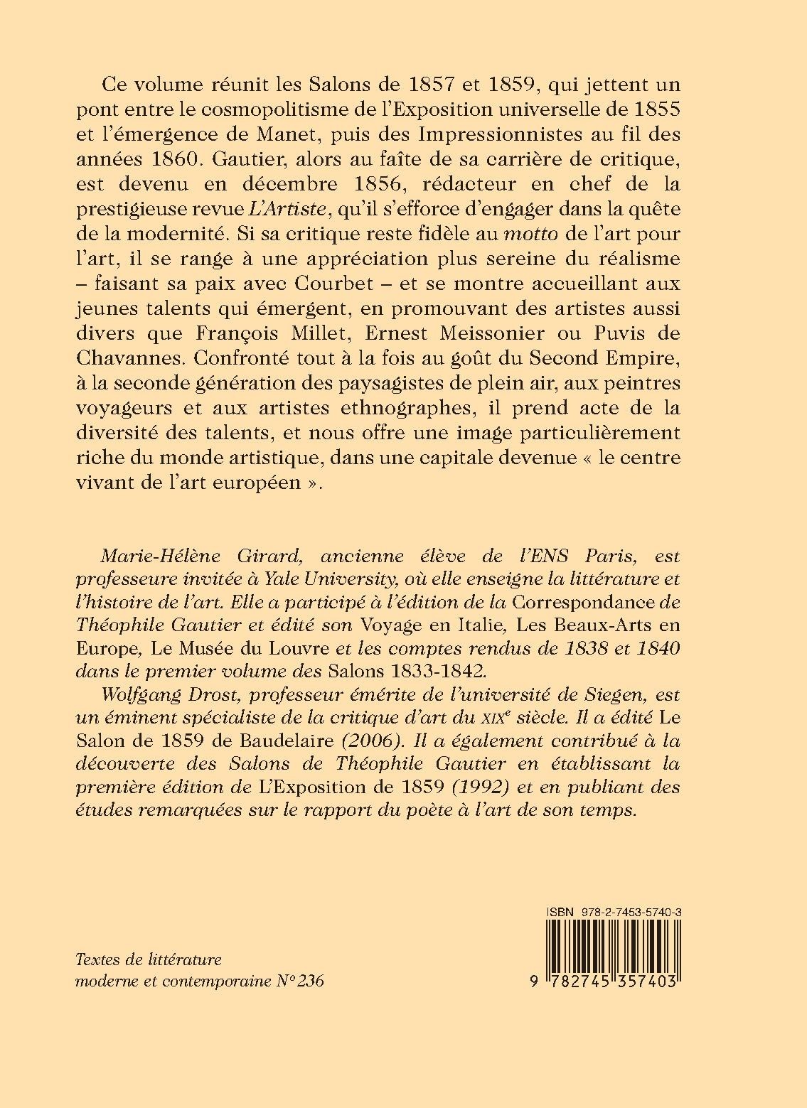 Ce volume réunit les Salons de 1857 et 1859, qui jettent un pont entre le cosmopolitisme de l’Exposition universelle de 1855 et l’émergence de Manet, puis des Impressionnistes au fil des années 1860. Gautier, alors au faîte de sa carrière de critique, est devenu en décembre 1856, rédacteur en chef de la prestigieuse revue L’Artiste, qu’il s’efforce d’engager dans la quête de la modernité. Si sa critique reste fidèle au motto de l’art pour l’art, il se range à une appréciation plus sereine du réalisme – faisant sa paix avec Courbet – et se montre accueillant aux jeunes talents qui émergent, en promouvant des artistes aussi divers que François Millet, Ernest Meissonier ou Puvis de Chavannes. Confronté tout à la fois au goût du Second Empire, à la seconde génération des paysagistes de plein air, aux peintres voyageurs et aux artistes ethnographes, il prend acte de la diversité des talents, et nous offre une image particulièrement riche du monde artistique, dans une capitale devenue « le centre vivant de l’art européen ».