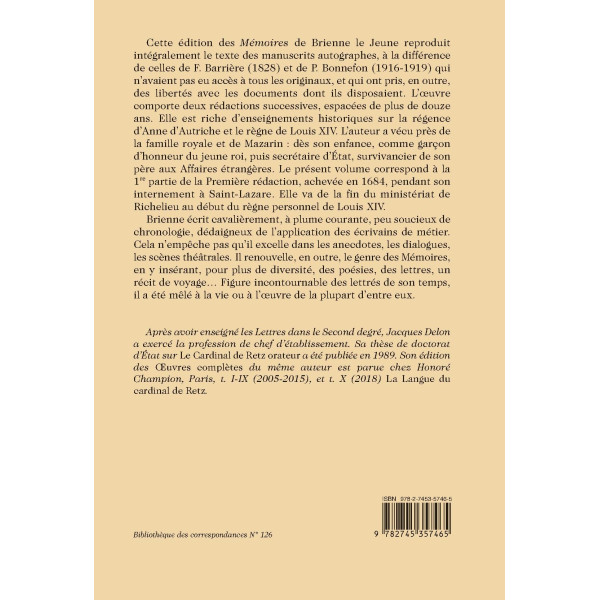 Cette édition des Mémoires de Brienne le Jeune reproduit intégralement le texte des manuscrits autographes, à la différence de celles de F. Barrière (1828) et de P. Bonnefon (1916-1919) qui n’avaient pas eu accès à tous les originaux, et qui ont pris, en outre, des libertés avec les documents dont ils disposaient. L’œuvre comporte deux rédactions successives, espacées de plus de douze ans. Elle est riche d’enseignements historiques sur la régence d’Anne d’Autriche et le règne de Louis XIV. L’auteur a vécu près de la famille royale et de Mazarin : dès son enfance, comme garçon d’honneur du jeune roi, puis secrétaire d’État, survivancier de son père aux Affaires étrangères. Le présent volume correspond à la 1re partie de la Première rédaction, achevée en 1684, pendant son internement à Saint-Lazare. Elle va de la fin du ministériat de Richelieu au début du règne personnel de Louis XIV.