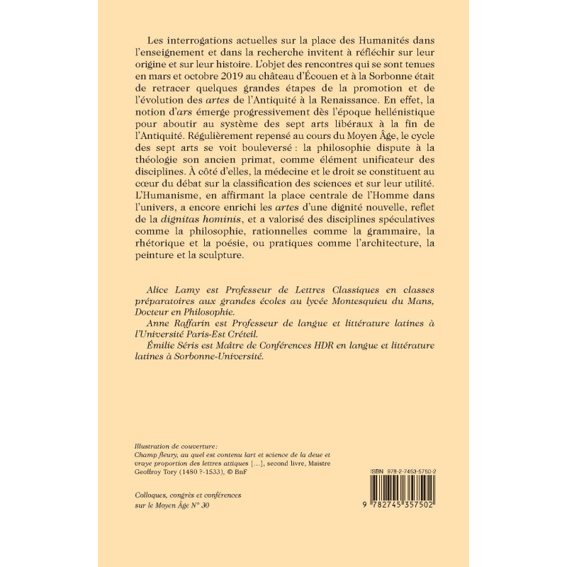 Les interrogations actuelles sur la place des Humanités dans l’enseignement et dans la recherche invitent à réfléchir sur leur origine et sur leur histoire. L’objet des rencontres qui se sont tenues en mars et octobre 2019 au château d’Écouen et à la Sorbonne était de retracer quelques grandes étapes de la promotion et de l’évolution des artes de l’Antiquité à la Renaissance. En effet, la notion d’ars émerge progressivement dès l’époque hellénistique pour aboutir au système des sept arts libéraux à la fin de l’Antiquité. Régulièrement repensé au cours du Moyen Âge, le cycle des sept arts se voit bouleversé : la philosophie dispute à la théologie son ancien primat, comme élément unificateur des disciplines. À côté d’elles, la médecine et le droit se constituent au cœur du débat sur la classification des sciences et sur leur utilité. L’Humanisme, en affirmant la place centrale de l’Homme dans l’univers, a encore enrichi les artes d’une dignité nouvelle, reflet de la dignitas hominis, et a valorisé des disciplines spéculatives comme la philosophie, rationnelles comme la grammaire, la rhétorique et la poésie, ou pratiques comme l’architecture, la peinture et la sculpture.