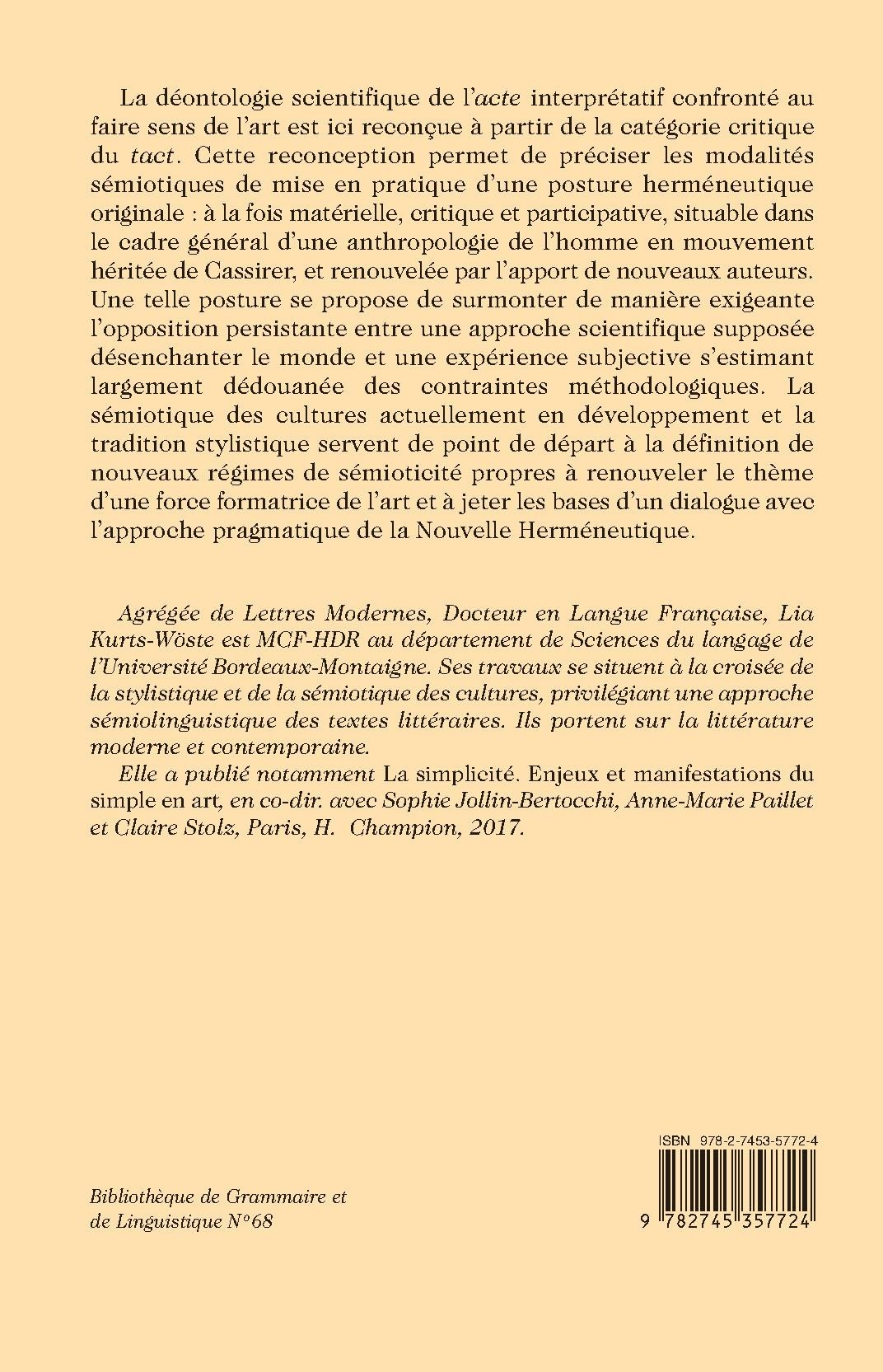 La déontologie scientifique de l’acte interprétatif confronté au faire sens de l’art est ici reconçue à partir de la catégorie critique du tact. Cette reconception permet de préciser les modalités sémiotiques de mise en pratique d’une posture herméneutique originale : à la fois matérielle, critique et participative, situable dans le cadre général d’une anthropologie de l’homme en mouvement héritée de Cassirer, et renouvelée par l’apport de nouveaux auteurs. Une telle posture se propose de surmonter de manière exigeante l’opposition persistante entre une approche scientifique supposée désenchanter le monde et une expérience subjective s’estimant largement dédouanée des contraintes méthodologiques. La sémiotique des cultures actuellement en développement et la tradition stylistique servent de point de départ à la définition de nouveaux régimes de sémioticité propres à renouveler le thème d’une force formatrice de l’art et à jeter les bases d’un dialogue avec l’approche pragmatique de la Nouvelle Herméneutique.