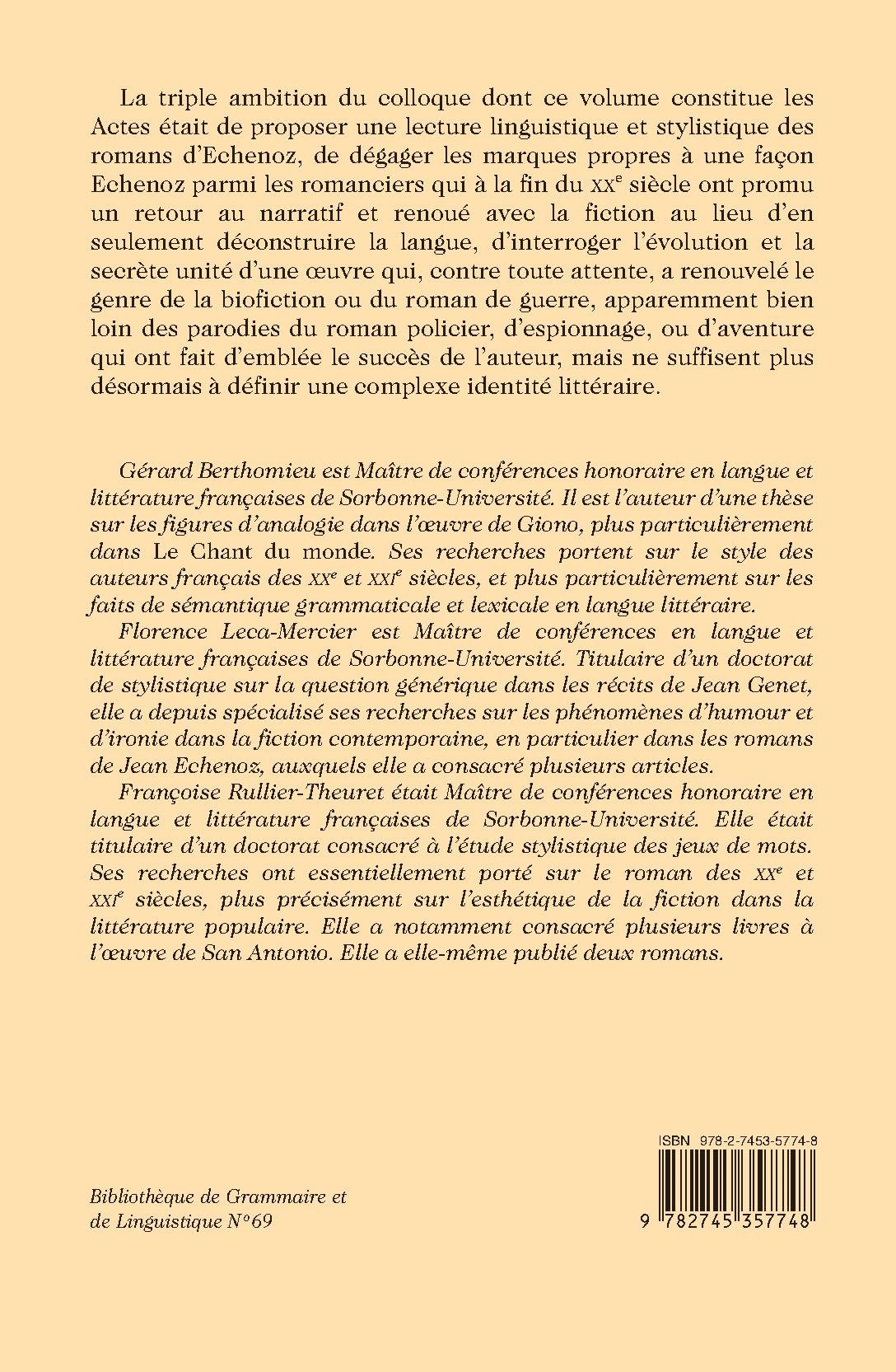 La triple ambition du colloque dont ce volume constitue les Actes était de proposer une lecture linguistique et stylistique des romans d’Echenoz, de dégager les marques propres à une façon Echenoz parmi les romanciers qui à la fin du XXe siècle ont promu un retour au narratif et renoué avec la fiction au lieu d’en seulement déconstruire la langue, d’interroger l’évolution et la secrète unité d’une œuvre qui, contre toute attente, a renouvelé le genre de la biofiction ou du roman de guerre, apparemment bien loin des parodies du roman policier, d’espionnage, ou d’aventure qui ont fait d’emblée le succès de l’auteur, mais ne suffisent plus désormais à définir une complexe identité littéraire.