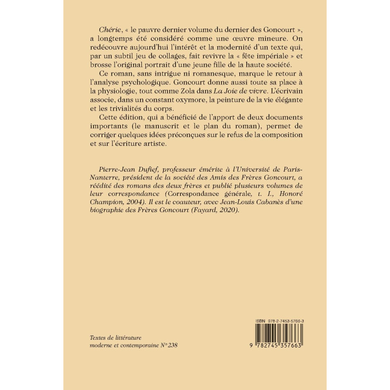 Chérie, « le pauvre dernier volume du dernier des Goncourt », a longtemps été considéré comme une œuvre mineure. On redécouvre aujourd’hui l’intérêt et la modernité d’un texte qui, par un subtil jeu de collages, fait revivre la « fête impériale » et brosse l’original portrait d’une jeune fille de la haute société.