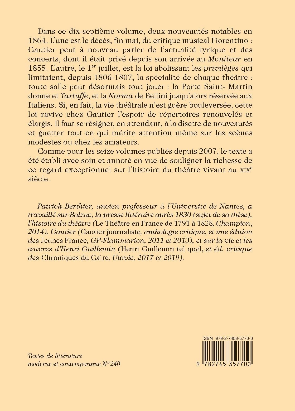 Dans ce dix-septième volume, deux nouveautés notables en 1864. L’une est le décès, fin mai, du critique musical Fiorentino : Gautier peut à nouveau parler de l’actualité lyrique et des concerts, dont il était privé depuis son arrivée au Moniteur en 1855. L’autre, le 1er juillet, est la loi abolissant les privilèges qui limitaient, depuis 1806-1807, la spécialité de chaque théâtre : toute salle peut désormais tout jouer : la Porte Saint- Martin donne et Tartuffe, et la Norma de Bellini jusqu’alors réservée aux Italiens. Si, en fait, la vie théâtrale n’est guère bouleversée, cette loi ravive chez Gautier l’espoir de répertoires renouvelés et élargis. Il faut se résigner, en attendant, à la disette de nouveautés et guetter tout ce qui mérite attention même sur les scènes modestes ou chez les amateurs.