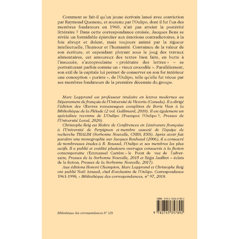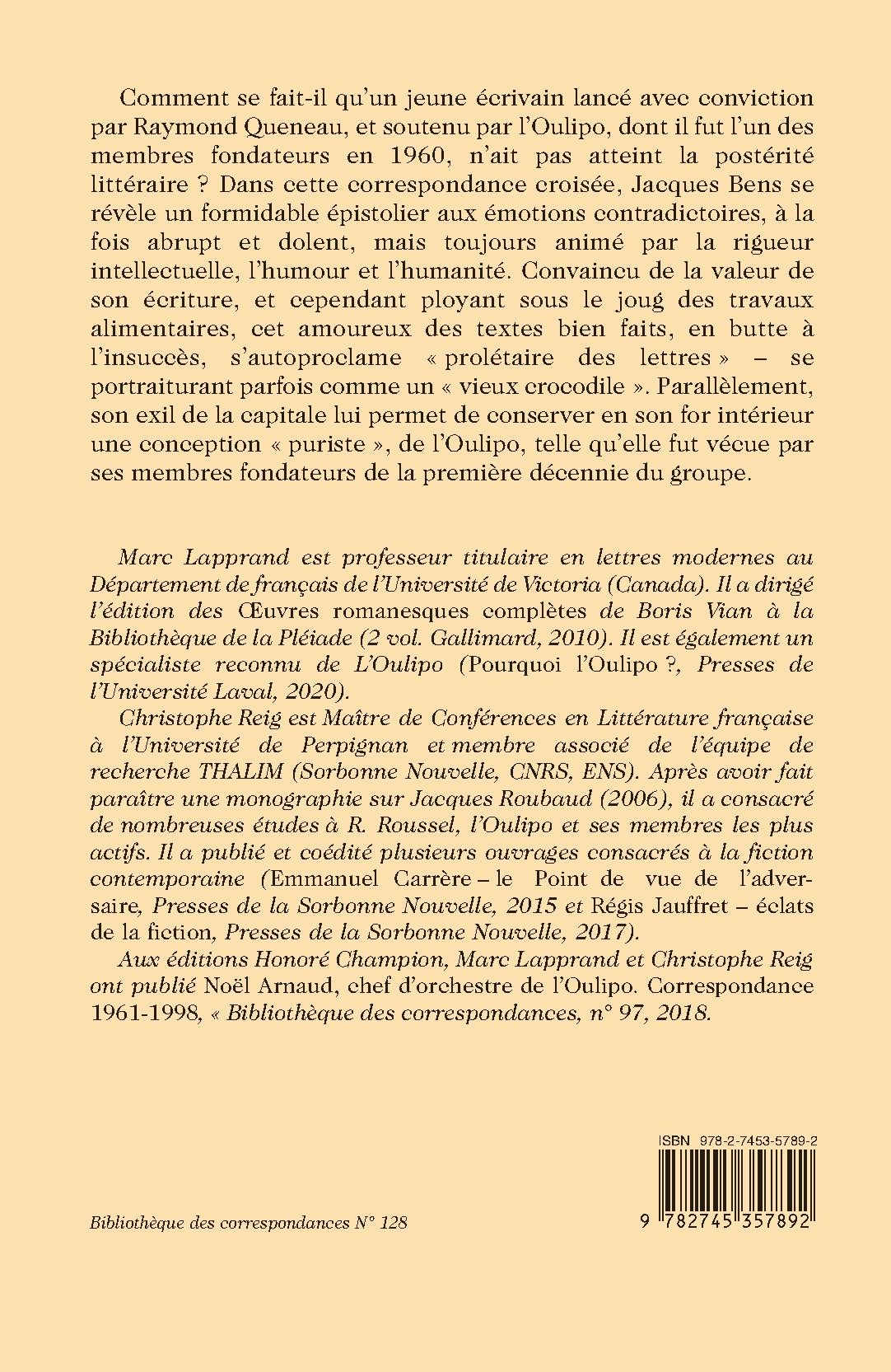 Comment se fait-il qu’un jeune écrivain lancé avec conviction par Raymond Queneau, et soutenu par l’Oulipo, dont il fut l’un des membres fondateurs en 1960, n’ait pas atteint la postérité littéraire ? Dans cette correspondance croisée, Jacques Bens se révèle un formidable épistolier aux émotions contradictoires, à la fois abrupt et dolent, mais toujours animé par la rigueur intellectuelle, l’humour et l’humanité. Convaincu de la valeur de son écriture, et cependant ployant sous le joug des travaux alimentaires, cet amoureux des textes bien faits, en butte à l’insuccès, s’autoproclame « prolétaire des lettres » – se portraiturant parfois comme un « vieux crocodile ». Parallèlement, son exil de la capitale lui permet de conserver en son for intérieur une conception « puriste », de l’Oulipo, telle qu’elle fut vécue par ses membres fondateurs de la première décennie du groupe.