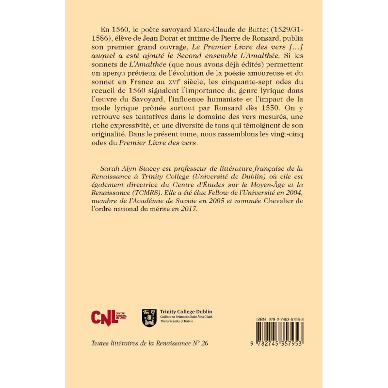 En 1560, le poète savoyard Marc-Claude de Buttet (1529/31- 1586), élève de Jean Dorat et intime de Pierre de Ronsard, publia son premier grand ouvrage, Le Premier Livre des vers […] auquel a esté ajouté le Second ensemble L’Amalthée. Si les sonnets de L’Amalthée (que nous avons déjà édités) permettent un aperçu précieux de l’évolution de la poésie amoureuse et du sonnet en France au XVIe siècle, les cinquante-sept odes du recueil de 1560 signalent l’importance du genre lyrique dans l’œuvre du Savoyard, l’influence humaniste et l’impact de la mode lyrique prônée surtout par Ronsard dès 1550. On y retrouve ses tentatives dans le domaine des vers mesurés, une riche expressivité, et une diversité de tons qui témoignent de son originalité. Dans le présent tome, nous rassemblons les vingt-cinq odes du Premier Livre des vers.