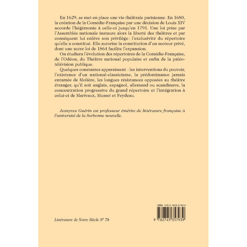 Quelques constantes apparaissent : les interventions du pouvoir, l’existence d’un national-classicisme, la prédominance jamais entamée de Molière, les longues résistances opposées au théâtre étranger, qu’il soit anglais, espagnol, allemand ou scandinave, la concentration progressive du grand répertoire et l’intégration à celui-ci de Marivaux, Musset et Feydeau.