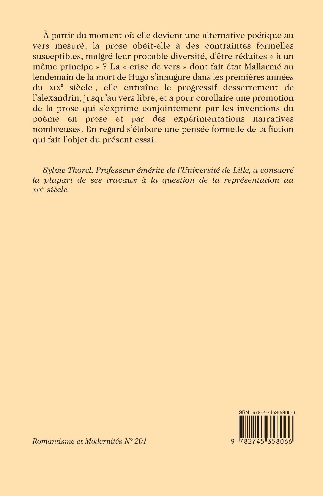 À partir du moment où elle devient une alternative poétique au vers mesuré, la prose obéit-elle à des contraintes formelles susceptibles, malgré leur probable diversité, d’être réduites « à un même principe » ? La « crise de vers » dont fait état Mallarmé au lendemain de la mort de Hugo s’inaugure dans les premières années du XIXe siècle ; elle entraîne le progressif desserrement de l’alexandrin, jusqu’au vers libre, et a pour corollaire une promotion de la prose qui s’exprime conjointement par les inventions du poème en prose et par des expérimentations narratives nombreuses. En regard s’élabore une pensée formelle de la fiction qui fait l’objet du présent essai.