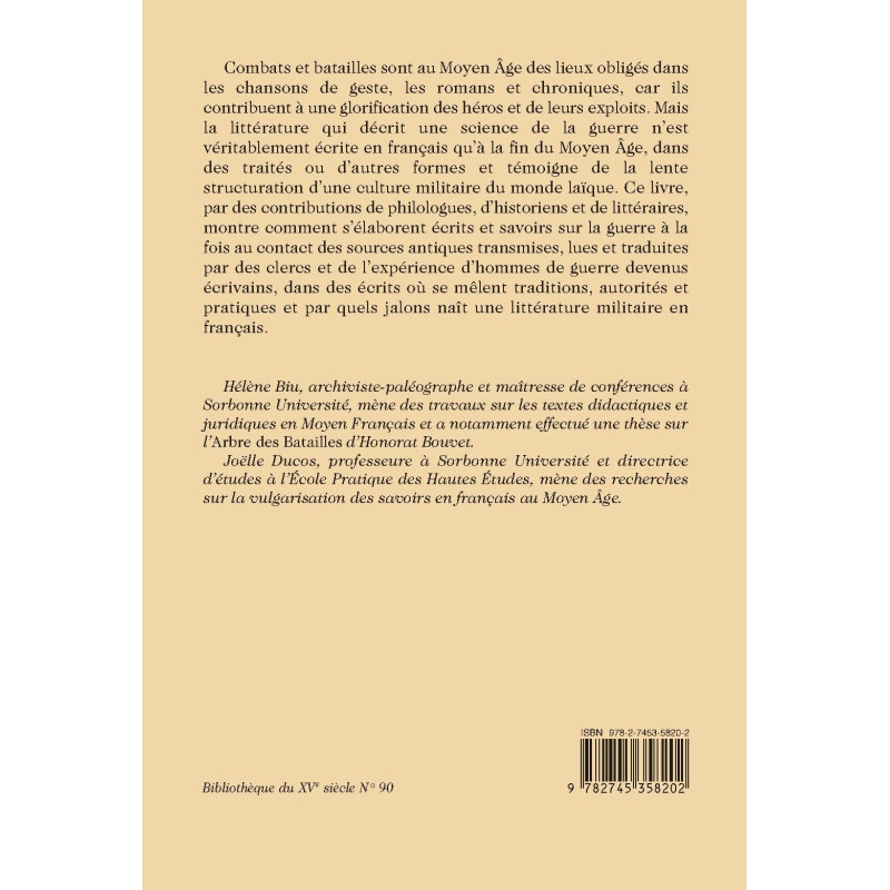 Combats et batailles sont au Moyen Âge des lieux obligés dans les chansons de geste, les romans et chroniques, car ils contribuent à une glorification des héros et de leurs exploits. Mais la littérature qui décrit une science de la guerre n’est véritablement écrite en français qu’à la fin du Moyen Âge, dans des traités ou d’autres formes et témoigne de la lente structuration d’une culture militaire du monde laïque. Ce livre, par des contributions de philologues, d’historiens et de littéraires, montre comment s’élaborent écrits et savoirs sur la guerre à la fois au contact des sources antiques transmises, lues et traduites par des clercs et de l’expérience d’hommes de guerre devenus écrivains, dans des écrits où se mêlent traditions, autorités et pratiques et par quels jalons naît une littérature militaire en français.