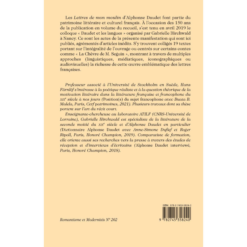 Les Lettres de mon moulin d’Alphonse Daudet font partie du patrimoine littéraire et culturel français. À l’occasion des 150 ans de la publication en volume du recueil, s’est tenu en avril 2019 le colloque « Daudet et les langues » organisé par Gabrielle Hirchwald à Nancy. Ce sont les actes de la présente manifestation qui sont ici publiés, agrémentés d’articles inédits. S’y trouvent colligés 19 textes portant sur l’intégralité de l’ouvrage ou centrés sur certains contes comme « La Chèvre de M. Seguin », montrant à travers de multiples approches (linguistiques, médiatiques, iconographiques ou audiovisuelles) la richesse de cette œuvre emblématique des lettres françaises.