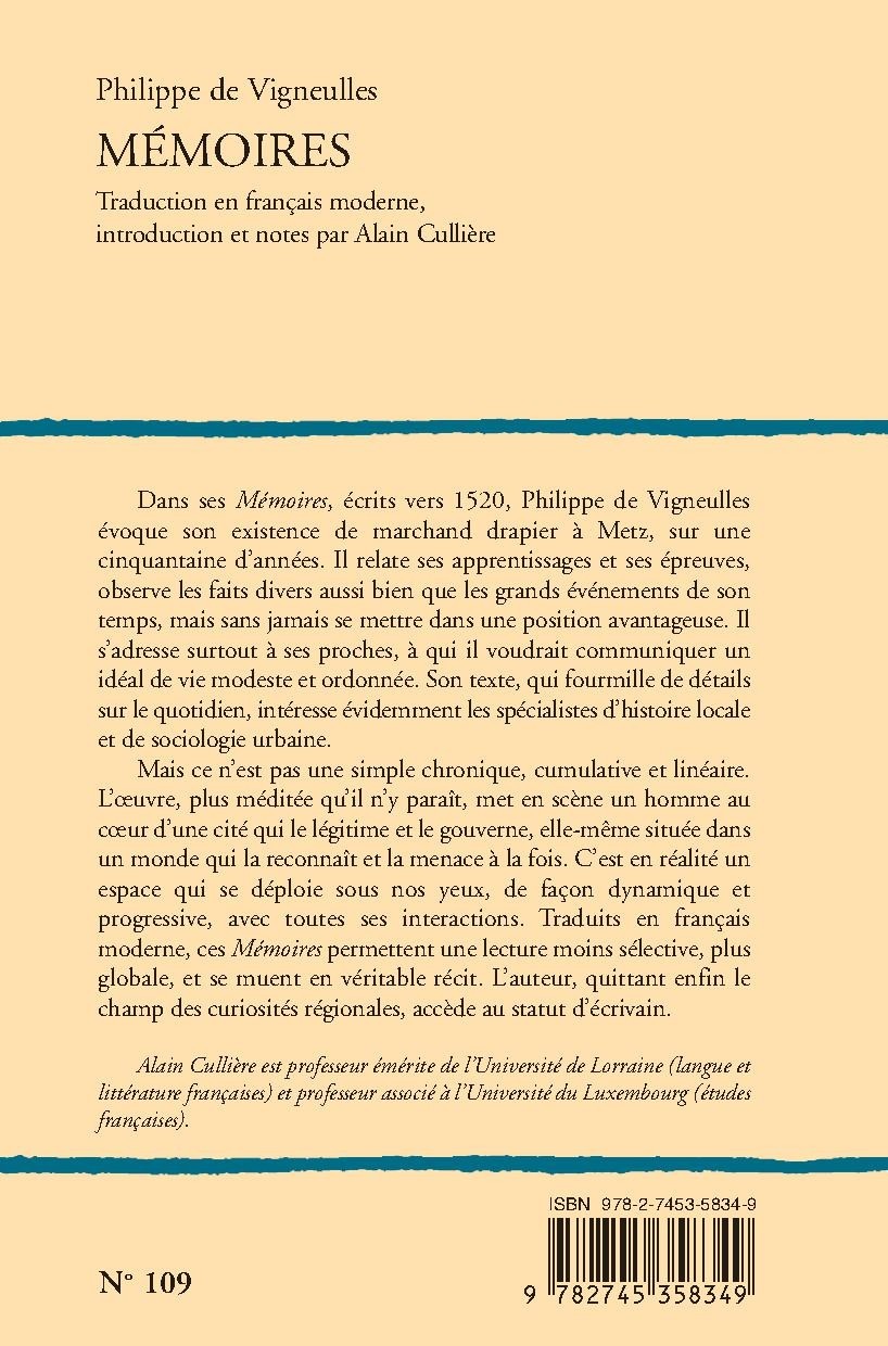 Dans ses Mémoires, écrits vers 1520, Philippe de Vigneulles évoque son existence de marchand drapier à Metz, sur une cinquantaine d’années. Il relate ses apprentissages et ses épreuves, observe les faits divers aussi bien que les grands événements de son temps, mais sans jamais se mettre dans une position avantageuse. Il s’adresse surtout à ses proches, à qui il voudrait communiquer un idéal de vie modeste et ordonnée. Son texte, qui fourmille de détails sur le quotidien, intéresse évidemment les spécialistes d’histoire locale et de sociologie urbaine.