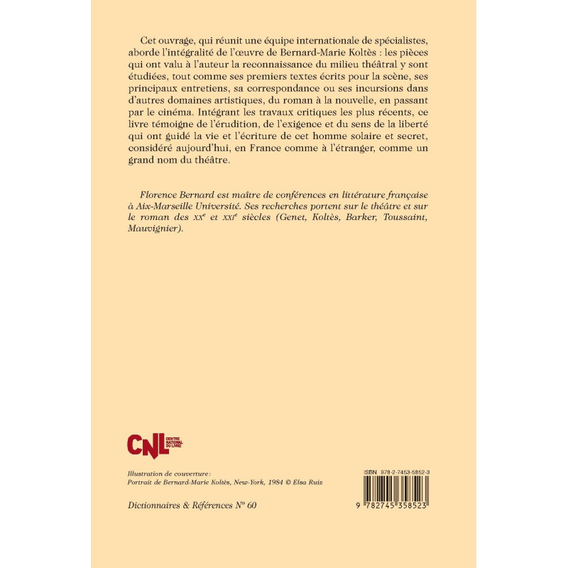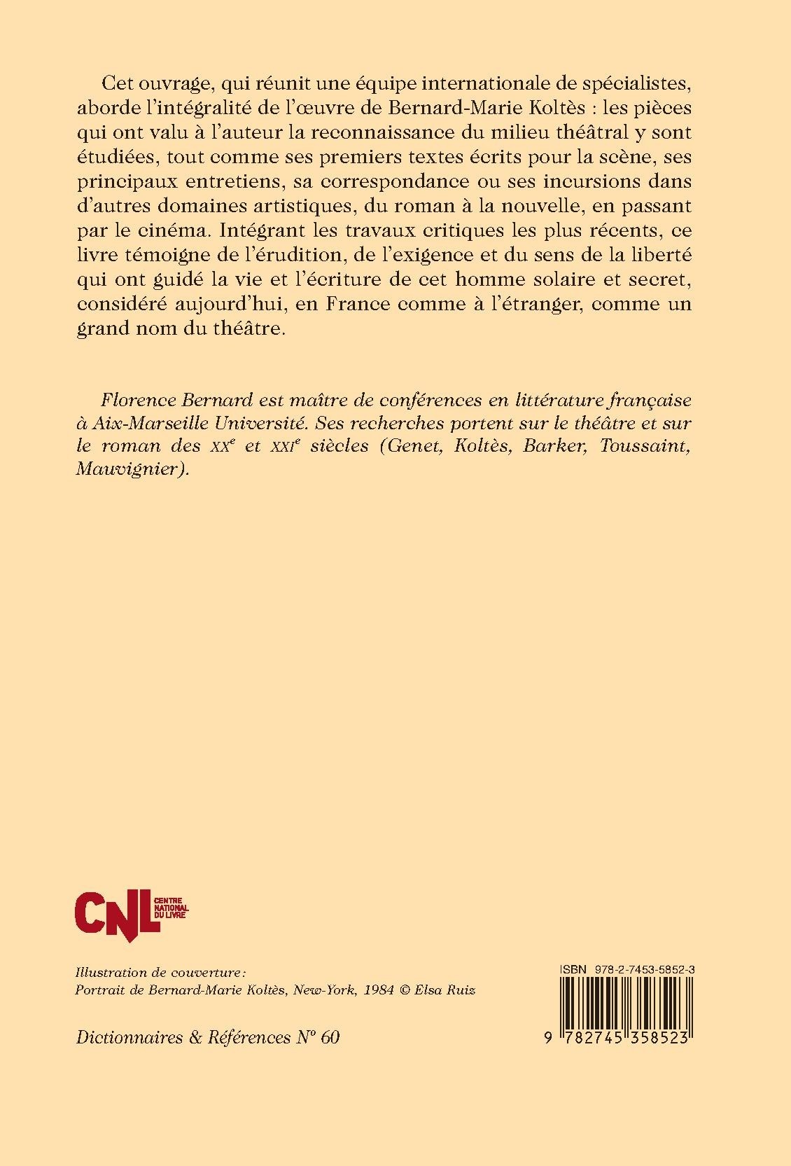 Cet ouvrage, qui réunit une équipe internationale de spécialistes, aborde l’intégralité de l’œuvre de Bernard-Marie Koltès : les pièces qui ont valu à l’auteur la reconnaissance du milieu théâtral y sont étudiées, tout comme ses premiers textes écrits pour la scène, ses principaux entretiens, sa correspondance ou ses incursions dans d’autres domaines artistiques, du roman à la nouvelle, en passant par le cinéma. Intégrant les travaux critiques les plus récents, ce livre témoigne de l’érudition, de l’exigence et du sens de la liberté qui ont guidé la vie et l’écriture de cet homme solaire et secret, considéré aujourd’hui, en France comme à l’étranger, comme un grand nom du théâtre.