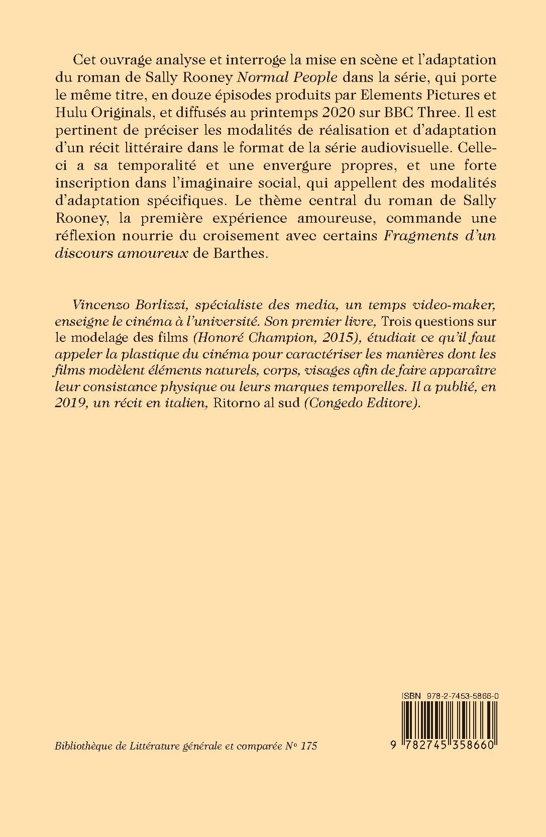 Cet ouvrage analyse et interroge la mise en scène et l’adaptation du roman de Sally Rooney Normal People dans la série, qui porte le même titre, en douze épisodes produits par Elements Pictures et Hulu Originals, et diffusés au printemps 2020 sur BBC Three. Il est pertinent de préciser les modalités de réalisation et d’adaptation d’un récit littéraire dans le format de la série audiovisuelle. Celle-ci a sa temporalité et une envergure propres, et une forte inscription dans l’imaginaire social, qui appellent des modalités d’adaptation spécifiques. Le thème central du roman de Sally Rooney, la première expérience amoureuse, commande une réflexion nourrie du croisement avec certains Fragments d’un discours amoureux de Barthes.