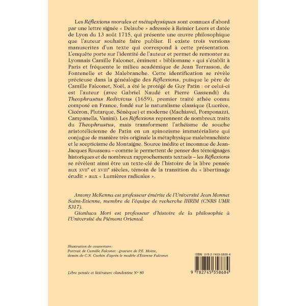Les Réflexions morales et métaphysiques sont connues d’abord par une lettre signée « Delaube » adressée à Reinier Leers et datée de Lyon du 13 août 1715, qui présente une œuvre philosophique que l’auteur souhaite faire publier. Il existe trois versions manuscrites d’un texte qui correspond à cette présentation. L’enquête porte sur l’identité de l’auteur et permet de remonter au Lyonnais Camille Falconet, éminent « bibliomane » qui s’établit à Paris et fréquente le milieu académique de Jean Terrasson, de Fontenelle et de Malebranche. Cette identification se révèle précieuse dans la généalogie des Réflexions, puisque le père de Camille Falconet, Noël, a été le protégé de Guy Patin : or celui-ci est l’auteur (avec Gabriel Naudé et Pierre Gassendi) du Theophrastus Redivivus (1659), premier traité athée connu composé en France, fondé sur le naturalisme classique (Lucrèce, Cicéron, Plutarque, Sénèque) et moderne (Machiavel, Pomponazzi, Campanella, Vanini). Les Réflexions reprennent de nombreux traits du Theophrastus, mais transforment l’athéisme de souche aristotélicienne de Patin en un spinozisme immatérialiste qui conjugue de manière très originale la métaphysique malebranchiste et le scepticisme de Montaigne. Source inédite et inconnue de Jean- Jacques Rousseau – comme le permettent de penser des témoignages historiques et de nombreux rapprochements textuels – les Réflexions se révèlent ainsi être un texte-clé de l’histoire de la libre pensée aux XVIIe et XVIIIe siècles, témoin de la transition du « libertinage érudit » aux « Lumières radicales ».