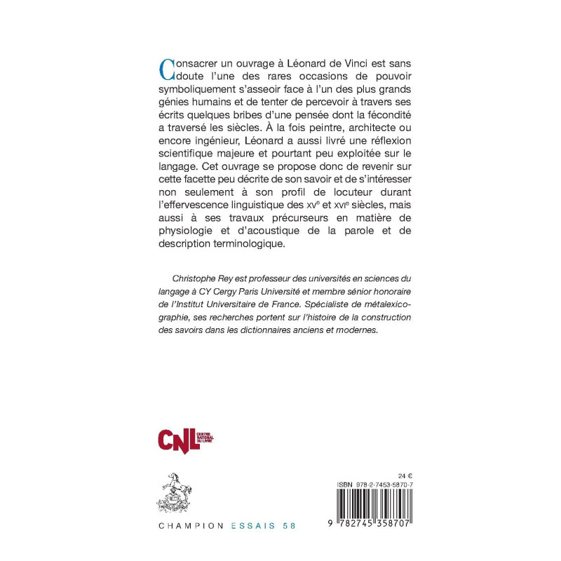 Consacrer un ouvrage à Léonard de Vinci est sans doute l’une des rares occasions de pouvoir symboliquement s’asseoir face à l’un des plus grands génies humains et de tenter de percevoir à travers ses écrits quelques bribes d’une pensée dont la fécondité a traversé les siècles. À la fois peintre, architecte ou encore ingénieur, Léonard a aussi livré une réflexion scientifique majeure et pourtant peu exploitée sur le langage. Cet ouvrage se propose donc de revenir sur cette facette peu décrite de son savoir et de s’intéresser non seulement à son profil de locuteur durant l’effervescence linguistique des XVe et XVIe siècles, mais aussi à ses travaux précurseurs en matière de physiologie et d’acoustique de la parole et de description terminologique.