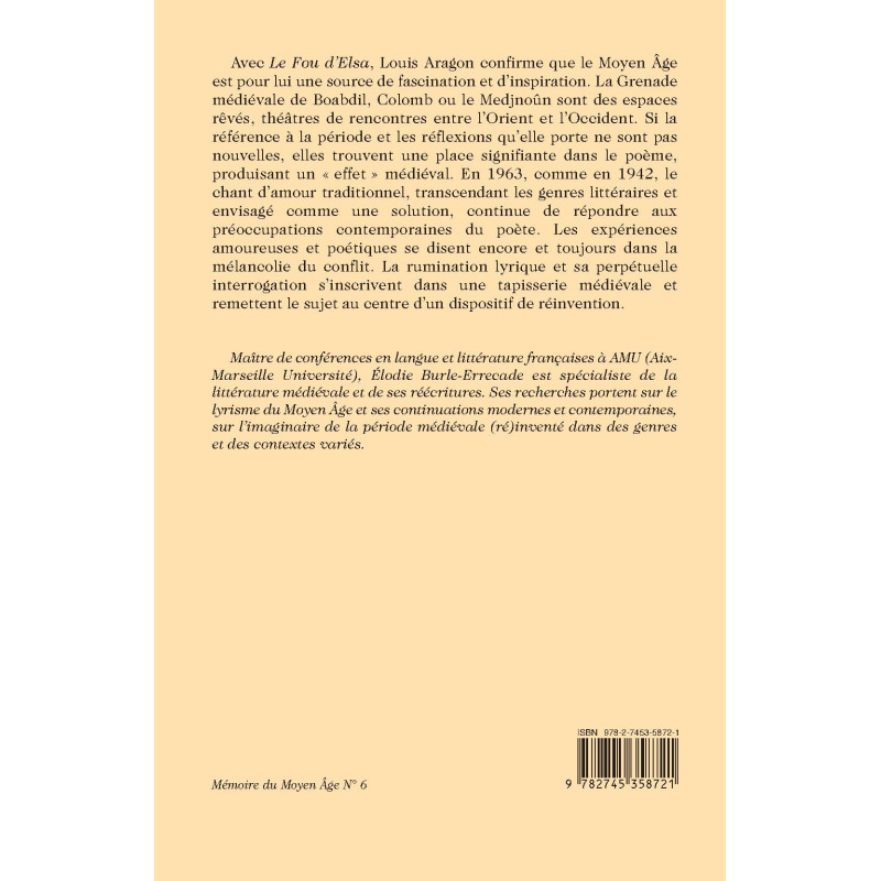 Avec Le Fou d’Elsa, Louis Aragon confirme que le Moyen Âge est pour lui une source de fascination et d’inspiration. La Grenade médiévale de Boabdil, Colomb ou le Medjnoûn sont des espaces rêvés, théâtres de rencontres entre l’Orient et l’Occident. Si la référence à la période et les réflexions qu’elle porte ne sont pas nouvelles, elles trouvent une place signifiante dans le poème, produisant un « effet » médiéval. En 1963, comme en 1942, le chant d’amour traditionnel, transcendant les genres littéraires et envisagé comme une solution, continue de répondre aux préoccupations contemporaines du poète. Les expériences amoureuses et poétiques se disent encore et toujours dans la mélancolie du conflit. La rumination lyrique et sa perpétuelle interrogation s’inscrivent dans une tapisserie médiévale et remettent le sujet au centre d’un dispositif de réinvention.
