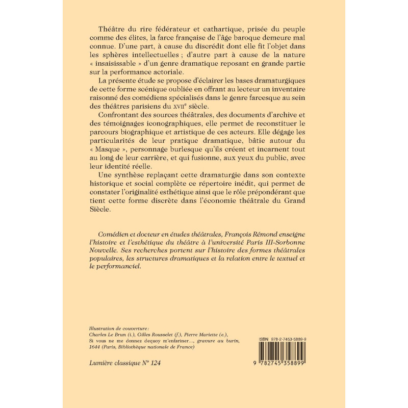 Théâtre du rire fédérateur et cathartique, prisée du peuple comme des élites, la farce française de l’âge baroque demeure mal connue. D’une part, à cause du discrédit dont elle fit l’objet dans les sphères intellectuelles ; d’autre part à cause de la nature « insaisissable » d’un genre dramatique reposant en grande partie sur la performance actoriale.