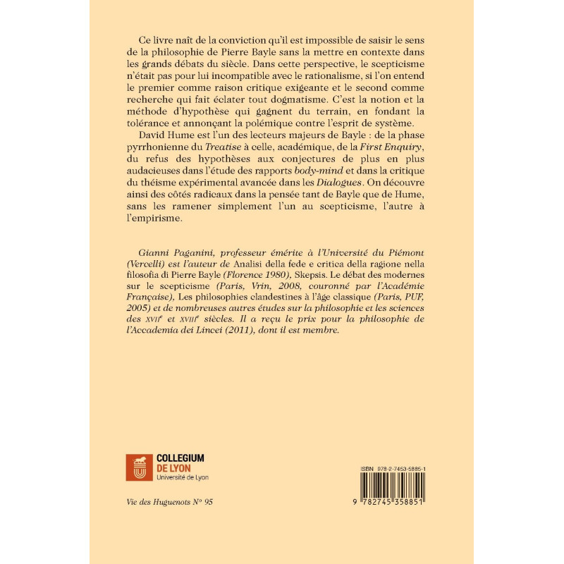 Gianni Paganini, professeur émérite à l’Université du Piémont (Vercelli) est l’auteur de Analisi della fede e critica della ragione nella filosofia di Pierre Bayle (Florence 1980), Skepsis. Le débat des modernes sur le scepticisme (Paris, Vrin, 2008, couronné par l’Académie Française), Les philosophies clandestines à l’âge classique (Paris, PUF, 2005) et de nombreuses autres études sur la philosophie et les sciences des XVIIe et XVIIIe siècles. Il a reçu le prix pour la philosophie de l’Accademia dei Lincei (2011), dont il est membre.