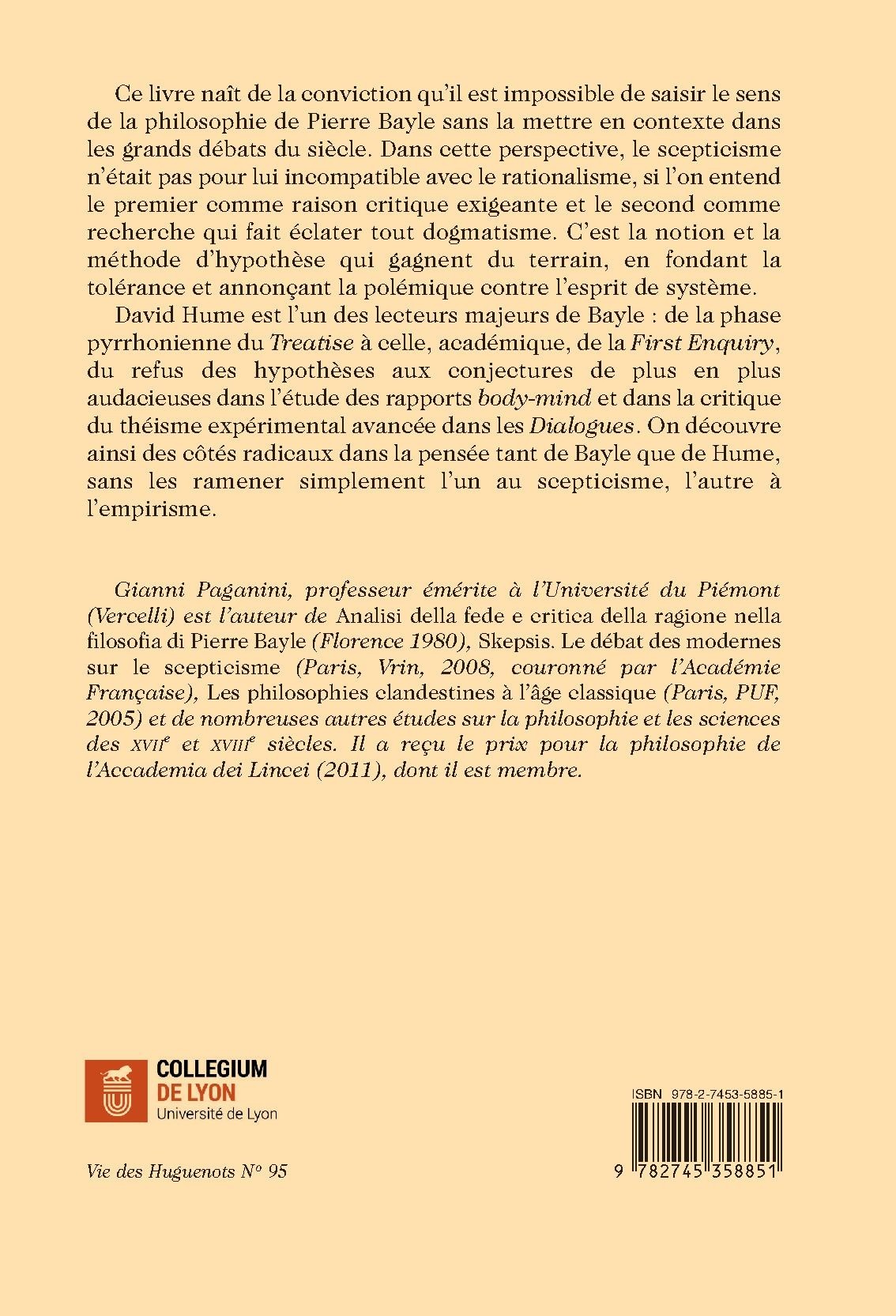 Ce livre naît de la conviction qu’il est impossible de saisir le sens de la philosophie de Pierre Bayle sans la mettre en contexte dans les grands débats du siècle. Dans cette perspective, le scepticisme n’était pas pour lui incompatible avec le rationalisme, si l’on entend le premier comme raison critique exigeante et le second comme recherche qui fait éclater tout dogmatisme. C’est la notion et la méthode d’hypothèse qui gagnent du terrain, en fondant la tolérance et annonçant la polémique contre l’esprit de système. David Hume est l’un des lecteurs majeurs de Bayle : de la phase pyrrhonienne du Treatise à celle, académique, de la First Enquiry, du refus des hypothèses aux conjectures de plus en plus audacieuses dans l’étude des rapports body-mind et dans la critique du théisme expérimental avancée dans les Dialogues. On découvre ainsi des côtés radicaux dans la pensée tant de Bayle que de Hume, sans les ramener simplement l’un au scepticisme, l’autre à l’empirisme.