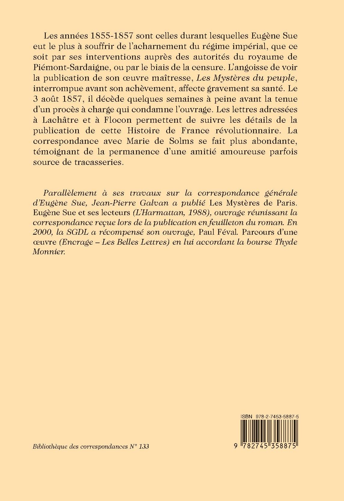 Les années 1855-1857 sont celles durant lesquelles Eugène Sue eut le plus à souffrir de l’acharnement du régime impérial, que ce soit par ses interventions auprès des autorités du royaume de Piémont-Sardaigne, ou par le biais de la censure. L’angoisse de voir la publication de son œuvre maîtresse, Les Mystères du peuple, interrompue avant son achèvement, affecte gravement sa santé. Le 3 août 1857, il décède quelques semaines à peine avant la tenue d’un procès à charge qui condamne l’ouvrage. Les lettres adressées à Lachâtre et à Flocon permettent de suivre les détails de la publication de cette Histoire de France révolutionnaire. La correspondance avec Marie de Solms se fait plus abondante, témoignant de la permanence d’une amitié amoureuse parfois source de tracasseries.