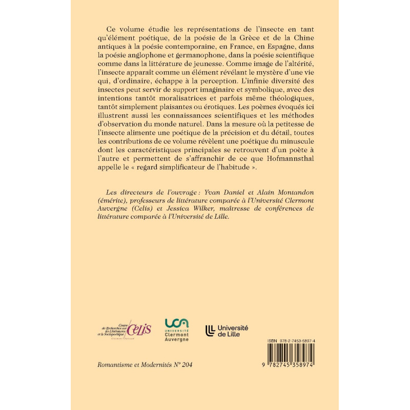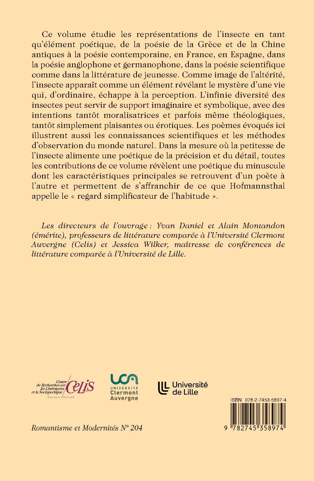 Ce volume étudie les représentations de l’insecte en tant qu’élément poétique, de la poésie de la Grèce et de la Chine antiques à la poésie contemporaine, en France, en Espagne, dans la poésie anglophone et germanophone, dans la poésie scientifique comme dans la littérature de jeunesse. Comme image de l’altérité, l’insecte apparaît comme un élément révélant le mystère d’une vie qui, d’ordinaire, échappe à la perception. L’infinie diversité des insectes peut servir de support imaginaire et symbolique, avec des intentions tantôt moralisatrices et parfois même théologiques, tantôt simplement plaisantes ou érotiques. Les poèmes évoqués ici illustrent aussi les connaissances scientifiques et les méthodes d’observation du monde naturel. Dans la mesure où la petitesse de l’insecte alimente une poétique de la précision et du détail, toutes les contributions de ce volume révèlent une poétique du minuscule dont les caractéristiques principales se retrouvent d’un poète à l’autre et permettent de s’affranchir de ce que Hofmannsthal appelle le « regard simplificateur de l’habitude ».