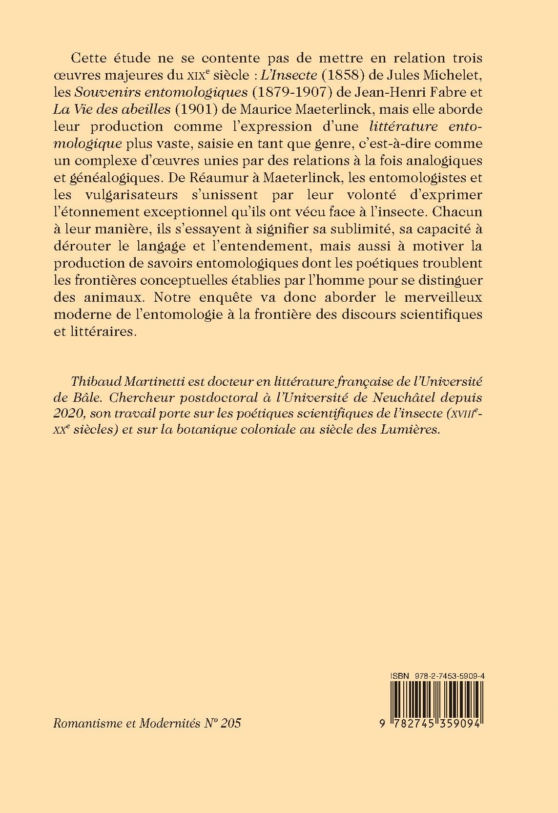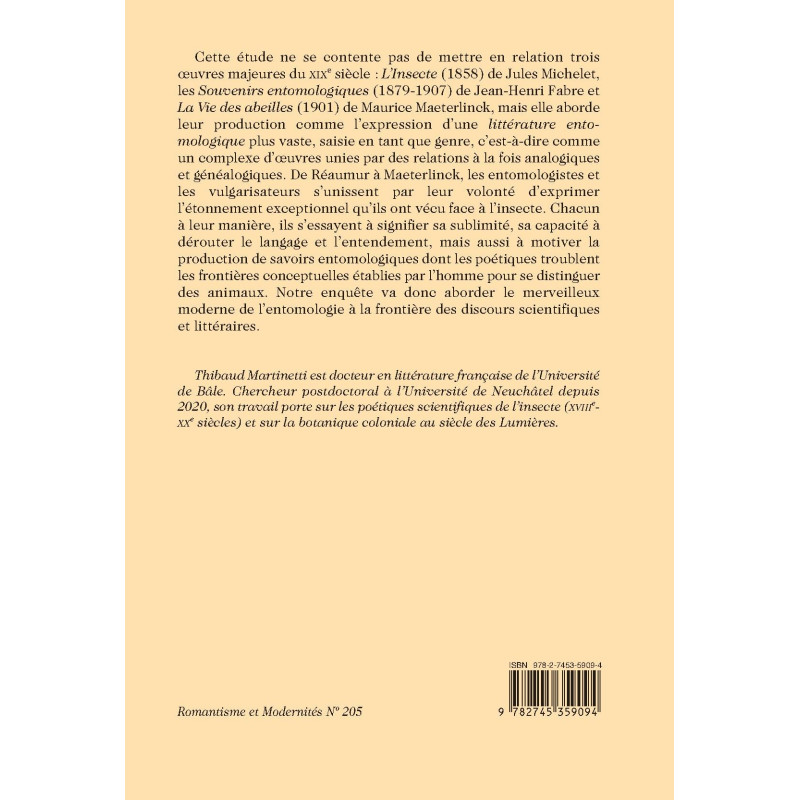 Cette étude ne se contente pas de mettre en relation trois œuvres majeures du XIXe siècle : L’Insecte (1858) de Jules Michelet, les Souvenirs entomologiques (1879-1907) de Jean-Henri Fabre et La Vie des abeilles (1901) de Maurice Maeterlinck, mais elle aborde leur production comme l’expression d’une littérature entomologique plus vaste, saisie en tant que genre, c’est-à-dire comme un complexe d’œuvres unies par des relations à la fois analogiques et généalogiques. De Réaumur à Maeterlinck, les entomologistes et les vulgarisateurs s’unissent par leur volonté d’exprimer l’étonnement exceptionnel qu’ils ont vécu face à l’insecte. Chacun à leur manière, ils s’essayent à signifier sa sublimité, sa capacité à dérouter le langage et l’entendement, mais aussi à motiver la production de savoirs entomologiques dont les poétiques troublent les frontières conceptuelles établies par l’homme pour se distinguer des animaux. Notre enquête va donc aborder le merveilleux moderne de l’entomologie à la frontière des discours scientifiques et littéraires.