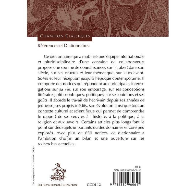 Ce dictionnaire qui a mobilisé une équipe internationale et pluridisciplinaire d’une centaine de collaborateurs propose une somme de connaissances sur Flaubert dans son siècle, sur ses œuvres et leur thématique, sur leurs avant-textes et leur réception jusqu’à l’époque contemporaine. Il comporte des notices qui répondent aux principales interrogations sur sa vie, sur son entourage, sur ses conceptions littéraires, philosophiques, politiques, sur ses opinions et ses goûts. Il aborde le travail de l’écrivain depuis ses années de jeunesse, ses projets inédits, son évolution ainsi que tout un contexte culturel et scientifique qui permet de comprendre le rapport de ses œuvres à l’histoire, à la politique, à la religion et aux savoirs. Certains articles plus longs font le point sur des sujets importants ou des domaines encore peu explorés. Avec plus de 650 notices, ce dictionnaire a l’ambition d’offrir un bilan et une ouverture sur les recherches actuelles.