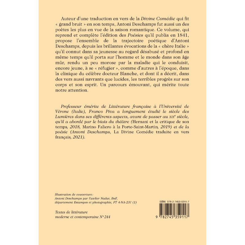 Auteur d’une traduction en vers de la Divine Comédie qui fit « grand bruit » en son temps, Antoni Deschamps fut aussi un des poètes les plus en vue de la saison romantique. Ce volume, qui reprend et complète l’édition des Poésies qu’il publia en 1841, propose l’ensemble de la trajectoire poétique d’Antoni Deschamps, depuis les brillantes évocations de la « chère Italie » qu’il connut dans sa jeunesse au regard désabusé et profond en même temps qu’il porta sur l’homme et le monde dans son âge mûr, rendu un peu morose par la maladie qui le conduisit, encore jeune, à se « réfugier », comme d’autres à l’époque, dans la clinique du célèbre docteur Blanche, et dont il a décrit, dans des vers aussi navrants que lucides, les terribles progrès sur son corps et son esprit. Un parcours émouvant, qui mérite toute notre attention.