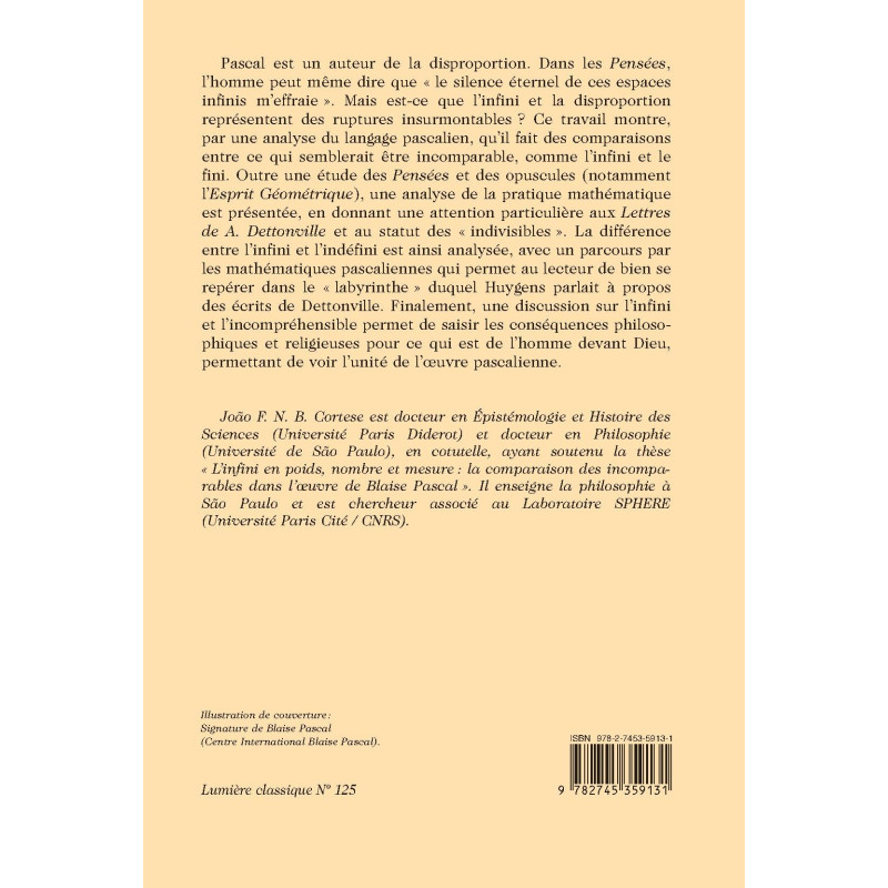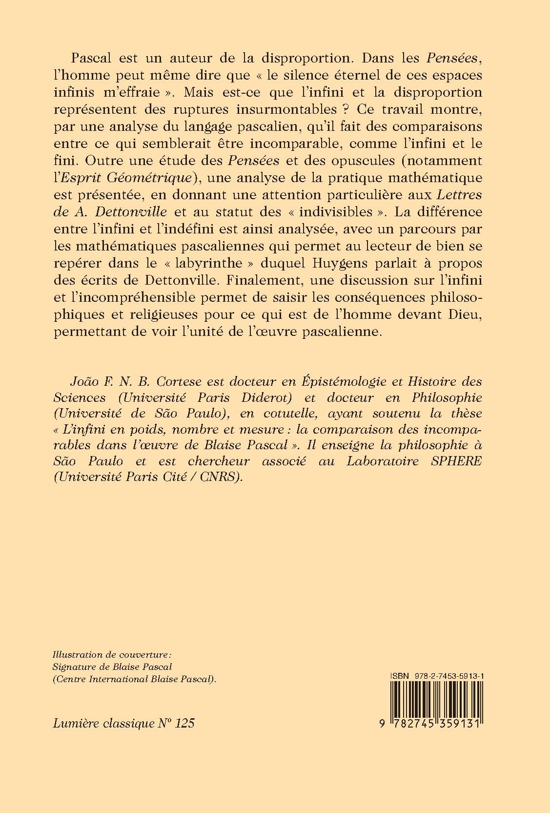 Pascal est un auteur de la disproportion. Dans les Pensées, l’homme peut même dire que « le silence éternel de ces espaces infinis m’effraie ». Mais est-ce que l’infini et la disproportion représentent des ruptures insurmontables ? Ce travail montre, par une analyse du langage pascalien, qu’il fait des comparaisons entre ce qui semblerait être incomparable, comme l’infini et le fini. Outre une étude des Pensées et des opuscules (notamment l’Esprit Géométrique), une analyse de la pratique mathématique est présentée, en donnant une attention particulière aux Lettres de A. Dettonville et au statut des « indivisibles ». La différence entre l’infini et l’indéfini est ainsi analysée, avec un parcours par les mathématiques pascaliennes qui permet au lecteur de bien se repérer dans le « labyrinthe » duquel Huygens parlait à propos des écrits de Dettonville. Finalement, une discussion sur l’infini et l’incompréhensible permet de saisir les conséquences philosophiques et religieuses pour ce qui est de l’homme devant Dieu, donnant à voir l’unité de l’œuvre pascalienne.