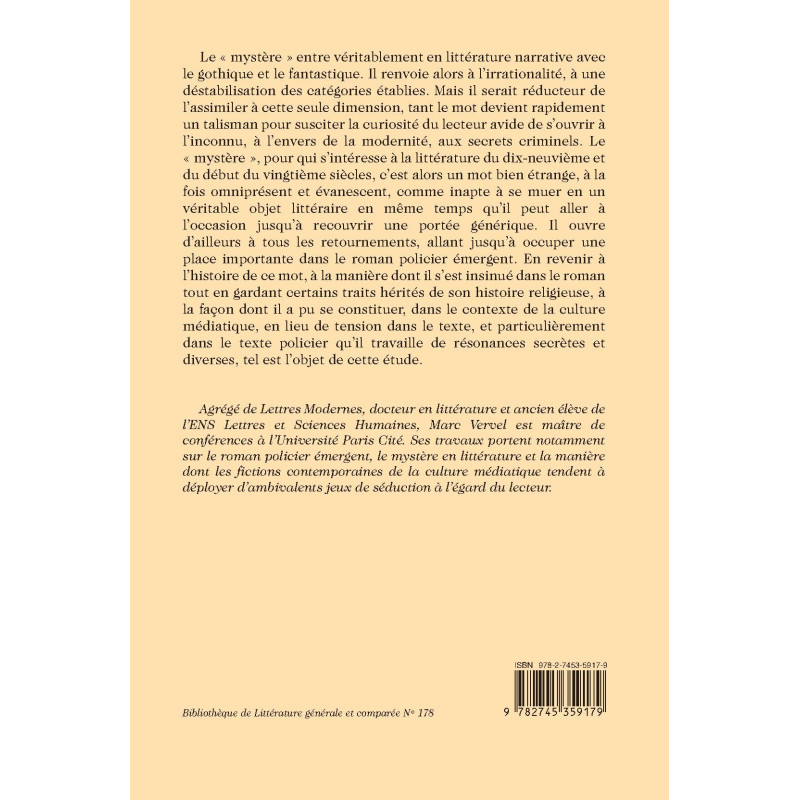 Le « mystère » entre véritablement en littérature narrative avec le gothique et le fantastique. Il renvoie alors à l’irrationalité, à une déstabilisation des catégories établies. Mais il serait réducteur de l’assimiler à cette seule dimension, tant le mot devient rapidement un talisman pour susciter la curiosité du lecteur avide de s’ouvrir à l’inconnu, à l’envers de la modernité, aux secrets criminels. Le « mystère », pour qui s’intéresse à la littérature du dix-neuvième et du début du vingtième siècles, c’est alors un mot bien étrange, à la fois omniprésent et évanescent, comme inapte à se muer en un véritable objet littéraire en même temps qu’il peut aller à l’occasion jusqu’à recouvrir une portée générique. Il ouvre d’ailleurs à tous les retournements, allant jusqu’à occuper une place importante dans le roman policier émergent. En revenir à l’histoire de ce mot, à la manière dont il s’est insinué dans le roman tout en gardant certains traits hérités de son histoire religieuse, à la façon dont il a pu se constituer, dans le contexte de la culture médiatique, en lieu de tension dans le texte, et particulièrement dans le texte policier qu’il travaille de résonances secrètes et diverses, tel est l’objet de cette étude.